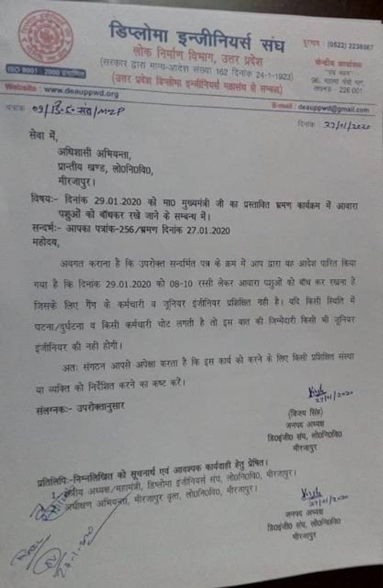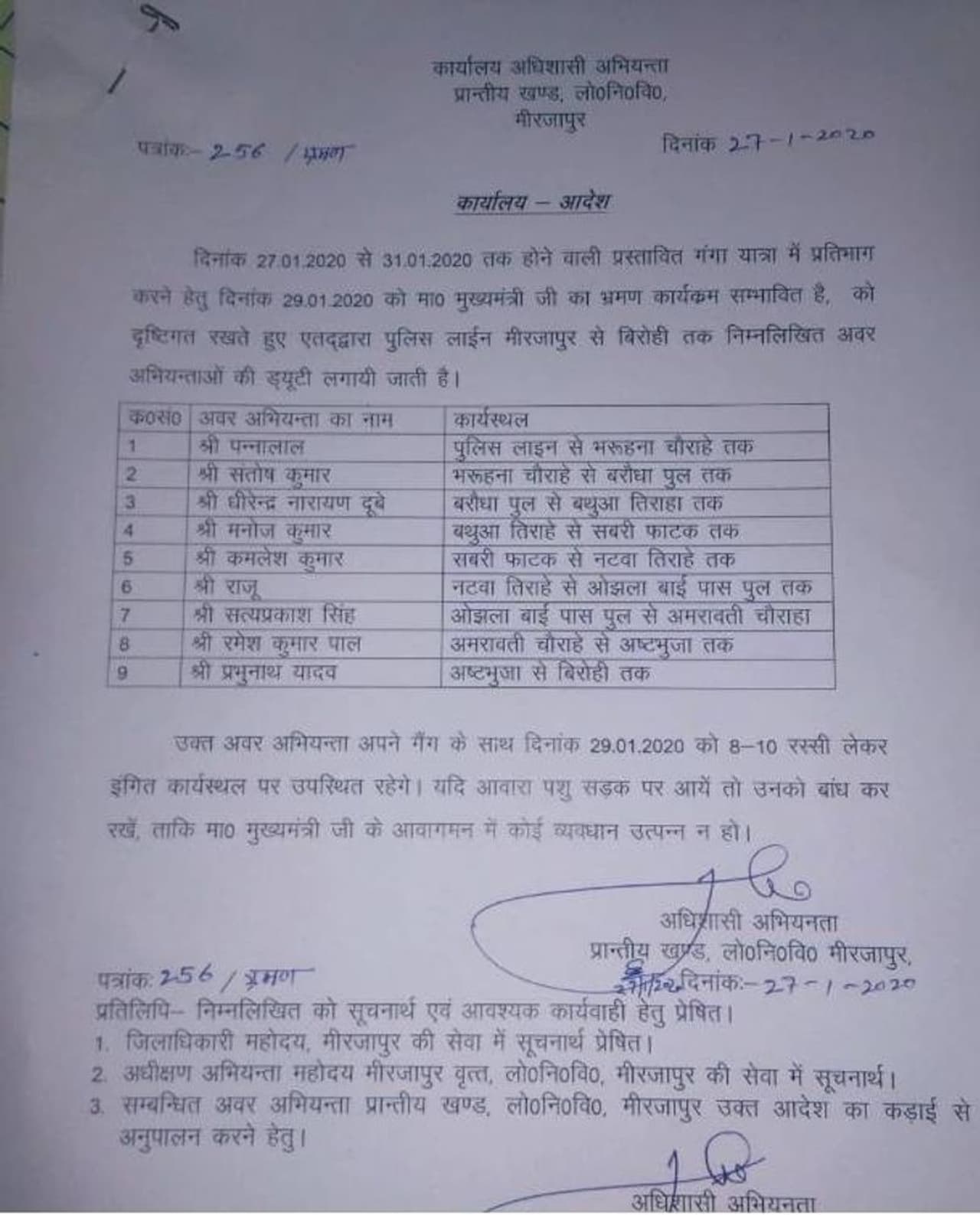 റോഡില് അലയുന്ന കന്നുകാലികളെ കണ്ടാലുടന് പിടിച്ചുകെട്ടാനാണ് എഞ്ചിനീയര്മാര്ക്ക് നിര്ദ്ദേശം നല്കിയത്. എട്ടു മുതല് പത്ത് കയറുകള് വരെ എഞ്ചിനീയര്മാര് ഇതിനായി കൊണ്ടുവരണമെന്നും പിഡബ്ല്യുഡി എക്സിക്യൂട്ടീവ് എഞ്ചിനീയറുടെ നിര്ദ്ദേശത്തില് പറയുന്നു. എന്നാല് എഞ്ചിനീയര്മാര്ക്ക് കന്നുകാലികളെ പിടിച്ചുകെട്ടുന്നതില് പരിശീലനം ലഭിച്ചിട്ടില്ലെന്നും ഈ ഉത്തരവാദിത്വം മറ്റേതെങ്കിലും ഏജന്സിയെ ഏല്പ്പിക്കാനും മിര്സാപൂര് എഞ്ചിനീയര് അസോസിയേഷന് നിര്ദ്ദേശത്തോട് പ്രതികരിച്ച് കത്തയച്ചിരുന്നു. ഇതേതുടര്ന്ന് കന്നുകാലികളെ പിടിക്കാന് എഞ്ചിനീയര്മാര്ക്ക് നിര്ദ്ദേശം നല്കിയ ഓര്ഡര് മിര്സാപൂര് ജില്ലാ അധികൃതര് ചൊവ്വാഴ്ച പിന്വലിച്ചതായി മിര്സാപൂര് ഡിഎം സുഷീല് പട്ടേല് പറഞ്ഞു. തിങ്കളാഴ്ചയാണ് അഞ്ചുദിവസം നീണ്ടു നില്ക്കുന്ന ഗംഗാ യാത്രയ്ക്ക് യോഗി ആദിത്യനാഥ് തുടക്കം കുറിച്ചത്.
