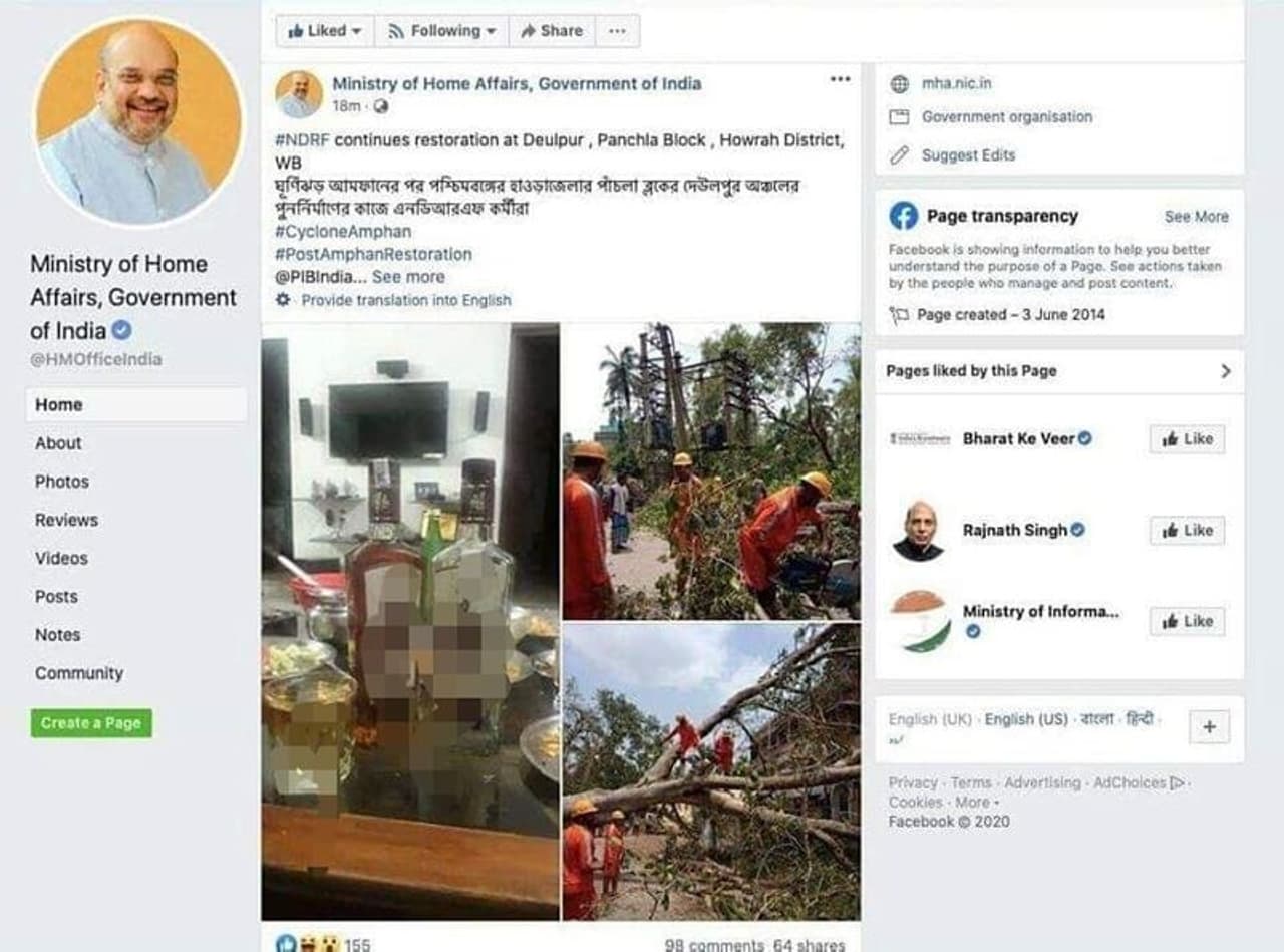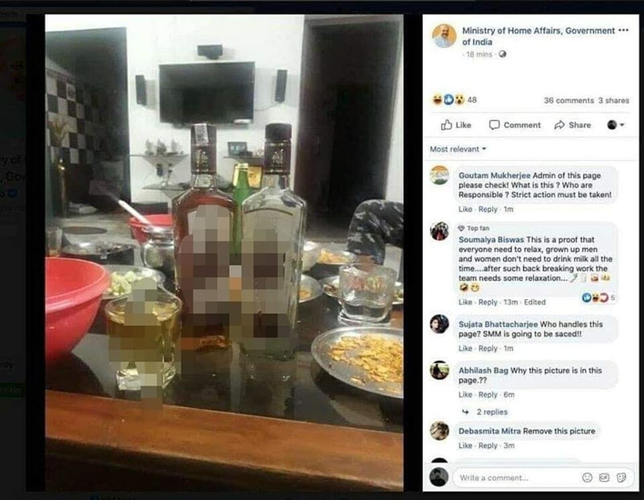 ഇന്ന് രാവിലെ കേന്ദ്ര ആഭ്യന്തര മന്ത്രാലയത്തിന്റെ വെരിഫൈഡ് (ബ്ലൂ ടിക്ക്ഡ്) പേജിൽ പ്രത്യക്ഷപ്പെട്ട ചിത്രം സകലരെയും ഞെട്ടിക്കുന്ന ഒന്നായിരുന്നു. ഒരു പ്രസിദ്ധ വിസ്കി ബ്രാൻഡിന്റെ രണ്ടുകുപ്പി മദ്യം. അതിൽ ഒന്ന് കാലി. ഒരു ഗ്ലാസിൽ മദ്യം ഒഴിച്ച് വെച്ചിരിക്കുന്നു. ചുറ്റും പല പ്ളേറ്റുകളിലായി ടച്ചിങ്സും നിരത്തി വെച്ചിരിക്കുന്നു. ഇത് ബംഗാളിലെ ഉംപുൺ കൊടുങ്കാറ്റിന്റെ ദുരന്തനിവാരണ പ്രവർത്തനങ്ങളെപ്പറ്റി പറയുന്ന ഒരു ഫേസ്ബുക്ക് പോസ്റ്റിലെ ചിത്രങ്ങളോടൊപ്പമാണ് ഈ വിവാദ ചിത്രവും പ്രത്യക്ഷപ്പെട്ടത്.