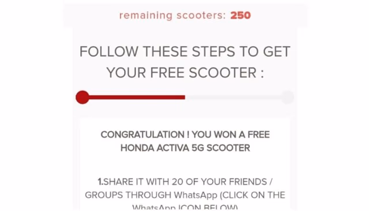 'ദീപാവലി പ്രമാണിച്ച് ഹോണ്ട 300 ആക്റ്റീവ 5G സ്കൂട്ടറുകള് സൗജന്യമായി നല്കുന്നു'- ഇതായിരുന്നു വാട്സാപ്പ് സന്ദേശം. രാജ്യത്ത് ഏറ്റവും കൂടുതല് വിറ്റഴിക്കപ്പെടുന്ന സ്കൂട്ടറുകളാണ് ആക്റ്റീവ എന്നത് ആളുകളുടെ ആവേശം കൂട്ടി.