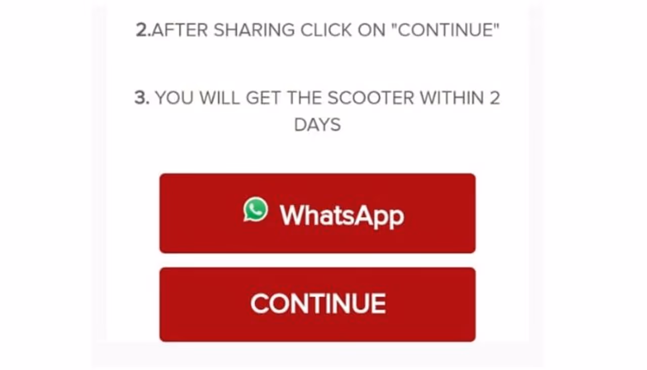 വൈബ്സൈറ്റില് കയറിയവര് യുആര്എല് ഒന്നും കൃത്യമായി വായിച്ചില്ല. 'ഇനി 250 എണ്ണം മാത്രമേ ബാക്കിയുള്ളൂ, വേഗമാകട്ടെ'... എന്ന് എന്ന് വെബ്സൈറ്റില് കണ്ടതോടെ ബുക്കിംഗിനായി വലിയ തിരക്കായി. അവശ്യമായ നിറം തെരഞ്ഞെടുത്ത് രജിസ്റ്റര് ചെയ്യുകയും ചെയ്തു ചിലര്. വാഹനം നിങ്ങള്ക്ക് ലഭിച്ചിരിക്കുന്നു(Grant) എന്ന് വെബ്സൈറ്റില് എഴുതിക്കാണിച്ചതോടെ ആളുകള് സ്കൂട്ടറും കാത്തിരുന്നു. ഈ സന്ദേശം 20 പേര്ക്ക് ഷെയര് ചെയ്താല് രണ്ട് ദിവസത്തിനുള്ളില് വാഹനം ലഭിക്കുമെന്നും വെബ്സൈറ്റിലുണ്ടായിരുന്നു. ആ വഴിക്കാണ് ഈ മെസേജ് വാട്സാപ്പില് പറന്നത്.
