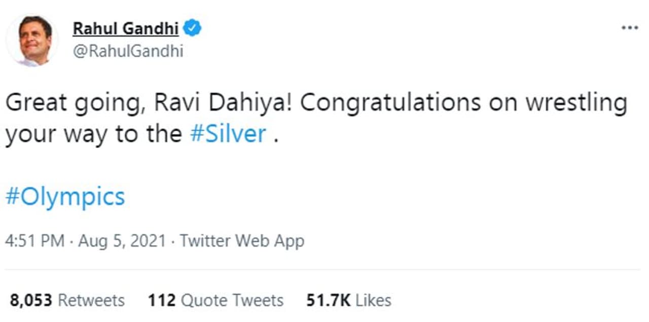 ഇതേ ഓഗസ്റ്റ് അഞ്ചാം തിയതി വൈകിട്ട് 4.51ന് രാഹുല് ഗാന്ധി ഒരു ട്വീറ്റ് ചെയ്തിട്ടുണ്ട് എന്ന് അദേഹത്തിന്റെ ട്വിറ്റര് ഹാന്ഡില് പരിശോധിച്ചാല് വ്യക്തമാണ്. എന്നാല് ഒളിംപിക്സ് വെള്ളി മെഡല് നേടിയ ഗുസ്തി താരം രവി ദഹിയയെ അഭിനന്ദിച്ചുകൊണ്ടാണ് ഈ ട്വീറ്റ്.
