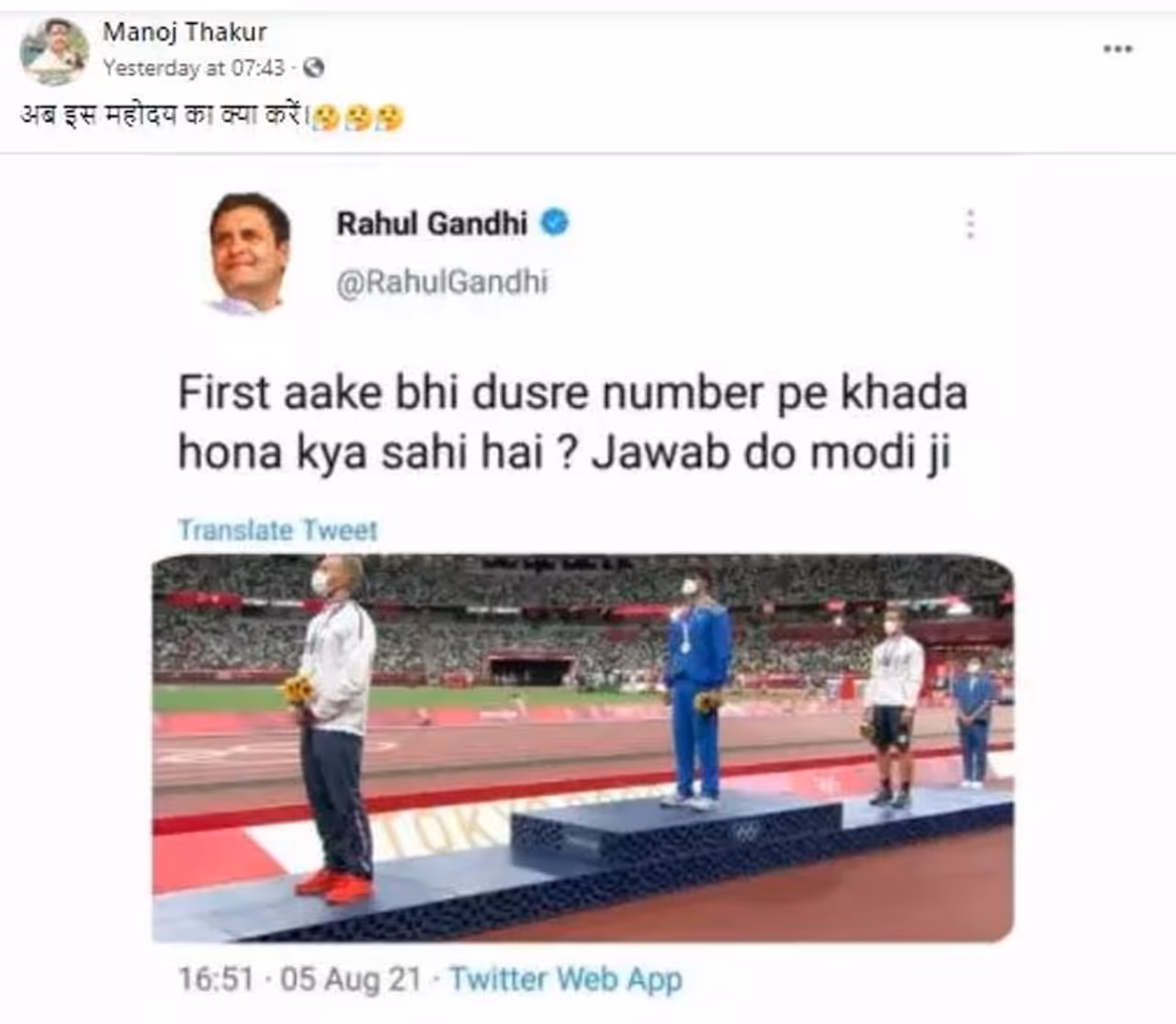 രാഹുല് ഗാന്ധിയുടെ വെരിഫൈഡ് അക്കാണ്ടില് നിന്ന് എന്ന് തോന്നിക്കുന്ന ഒരു ട്വീറ്റിന്റെ സ്ക്രീന്ഷോട്ടാണ് വൈറലായിരിക്കുന്നത്. ടോക്കിയോയില് നീരജ് ചോപ്ര വെള്ളി, വെങ്കല മെഡല് ജേതാക്കള്ക്കൊപ്പം പോഡിയത്തില് നില്ക്കുന്നതാണ് ചിത്രം. ഒന്നാമതെത്തിയിട്ടും നീരജ് രണ്ടാമത് നില്ക്കുന്നത് ശരിയാണോ? ഉത്തരം തരൂ, മോദി ജി എന്ന ചോദ്യത്തോടെ രാഹുല് ഈ ചിത്രം സഹിതം ട്വീറ്റ് ചെയ്തതായാണ് സ്ക്രീന്ഷോട്ട് പ്രചരിക്കുന്നത്.