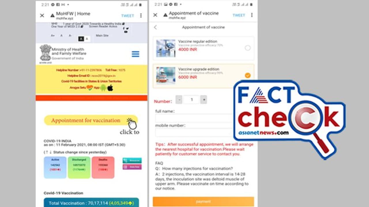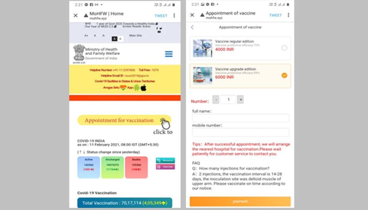 ഒറ്റനോട്ടത്തില് ആരോഗ്യമന്ത്രാലയത്തിന്റെ ഔദ്യോഗിക വെബ്സൈറ്റ് എന്ന് തോന്നും. കൊവിഡ് ഡാഷ്ബോര്ഡും വാക്സിന് എടുത്ത ആളുകളുടെ കണക്കും ലേറ്റസ്റ്റ് അപ്ഡേറ്റുകളും മറ്റ് വിവരങ്ങളുമെല്ലാമുള്ള സമാനം. 99 ശതമാനം വിജയസാധ്യതയുള്ള വാക്സിന് 6000 രൂപയും 70 ശതമാനം കാര്യക്ഷമതയുള്ളതിന് 4000 രൂപയും നല്കണം എന്നാണ് കൊടുത്തിരിക്കുന്ന വിവരം. വിശ്വാസ്യതയ്ക്ക് ഫൈസര് കമ്പനിയുടെ ലോഗോയുമുണ്ട്.