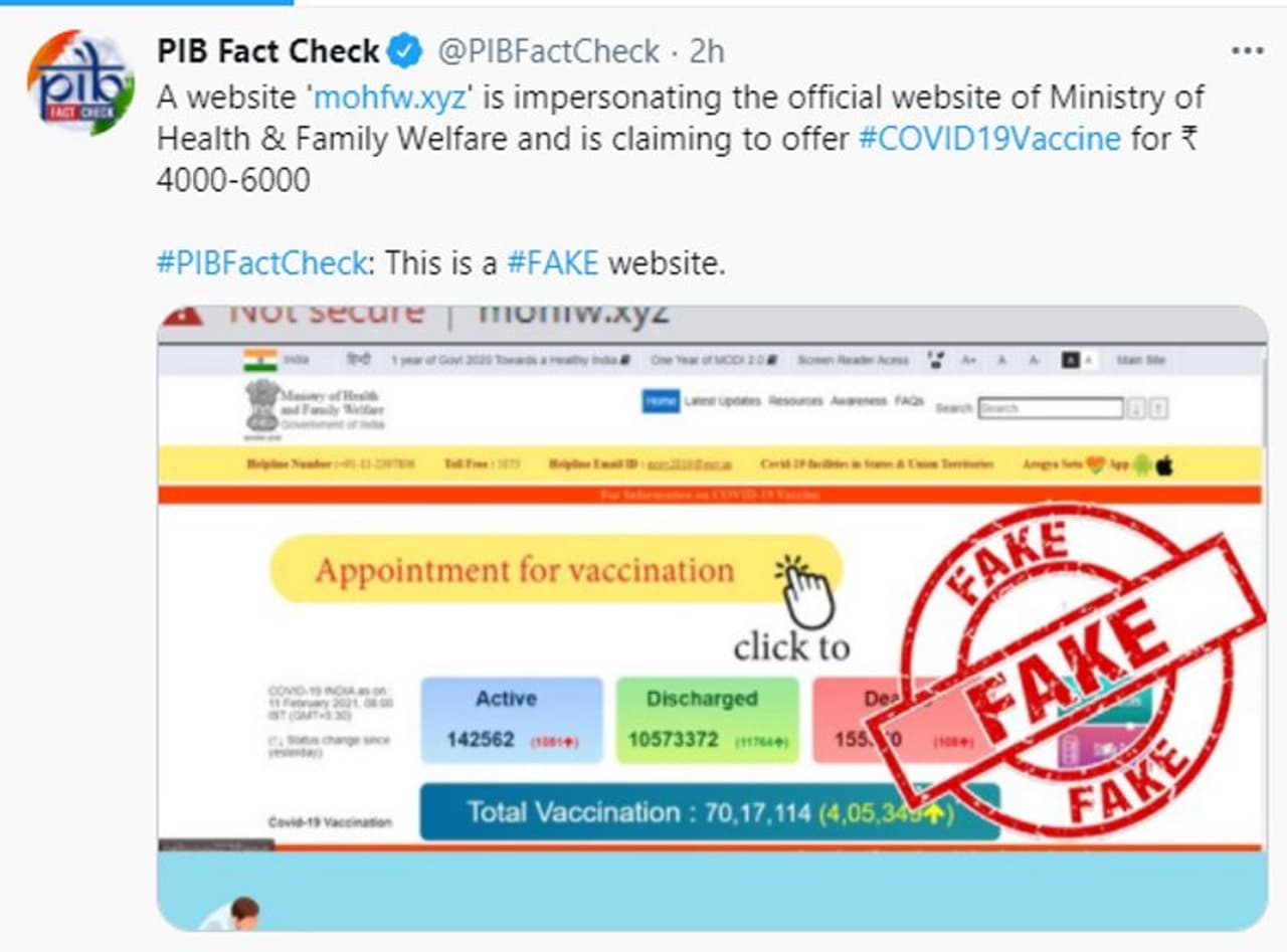 പ്രചരിക്കുന്ന വെബ്സൈറ്റ് വ്യാജമാണ് എന്ന് വ്യക്തമാക്കി കേന്ദ്ര സര്ക്കാര് രംഗത്തെത്തിയിട്ടുണ്ട്. ആരോഗ്യവുമായി ബന്ധപ്പെട്ട വിശ്വസനീയമായ വിവരങ്ങള്ക്ക് ആരോഗ്യമന്ത്രാലയത്തിന്റെ ഔദ്യോഗിക വെബ്സൈറ്റായ https://www.mohfw.gov.in/ സന്ദര്ശിക്കാന് പിഐബി ആവശ്യപ്പെട്ടു. പ്രസ് ഇന്ഫര്മേഷന് ബ്യൂറോയുടെ ട്വീറ്റ് ചുവടെ.