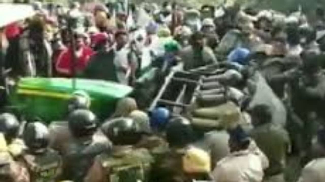 ട്രാക്ടർ ബാരിക്കേഡുകൾക്ക് മുകളിലേക്ക് ഓടിച്ച് കയറ്റുമ്പോൾ പൊലീസ് തടയാൻ ശ്രമിക്കുന്നുണ്ടെങ്കിലും കഷകരുടെ പ്രതിഷേധത്തിന് മുന്നിൽ ബാരിക്കേഡുകൾ തകർന്നുവീഴുന്നത്...