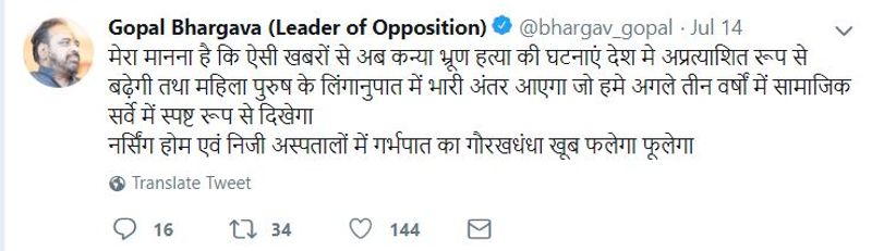 ട്വിറ്ററിലൂടെയാണ് ബിജെപി എം എല്എയും പാര്ട്ടിയുടെ മധ്യപ്രദേശില് നിന്നുള്ള പ്രമുഖ നേതാവുമായ ഗോപാല് സിങ് ഭാര്ഗവ വിഷയത്തില് പ്രതികരണം നടത്തിയത്. 'ഇത്തരം സംഭവങ്ങളാണ് രാജ്യത്ത് പെണ്ഭ്രൂണഹത്യ വര്ധിക്കുന്നതിന് കാരണമാകുന്നത്. ഇത് രാജ്യത്തെ സ്ത്രീ-പുരുഷ അനുപാതത്തെ സാരമായി ബാധിക്കുന്നു. മൂന്ന് വര്ഷത്തെ ഏത് സര്വ്വേ വിലയിരുത്തിയാലും ഈ കണക്കുകള് പ്രകടമാണ്. ഇതോടെ നിയമാനുസൃതമല്ലാത്ത ഭ്രൂണഹത്യാനിരക്ക് രാജ്യത്ത് നാലുമടങ്ങായി വര്ധിച്ചു'- ഗോപാല് ഭാര്ഗവ ട്വിറ്ററില് കുറിച്ചു.