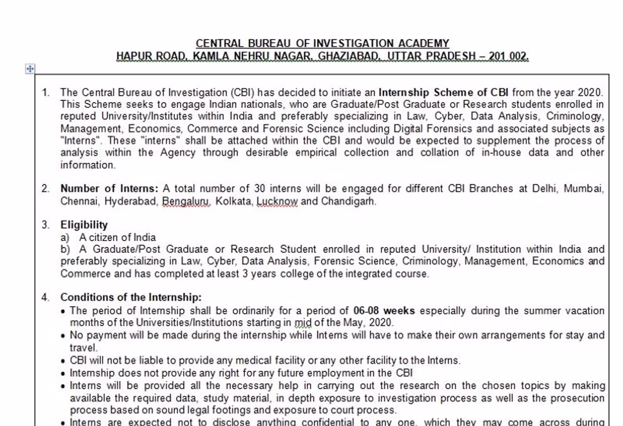 സിബിഐയുടെ ചരിത്രത്തിൽ ആദ്യമായി ബിരുദ, ബിരുദാനന്തര ബിരുദ, ഗവേഷക വിദ്യാർത്ഥികൾക്കായി ഇന്റേൺഷിപ്പിനുള്ള അവസരമൊരുക്കിയിരിക്കുകയാണ് ഇന്ത്യയിലെ ഏറ്റവും മികച്ച കുറ്റാന്വേഷണ സ്ഥാപനമായ സിബിഐ അഥവാ സെൻട്രൽ ഇൻവെസ്റ്റിഗേഷൻ ബ്യൂറോ. അപേക്ഷിക്കുന്നവരിൽ നിന്ന് തെരഞ്ഞെടുക്കപ്പെടുന്ന ചുരുക്കം പേർക്ക് വിവരശേഖരണം, ഡാറ്റാ അനാലിസിസ്, അന്വേഷണ തന്ത്രങ്ങൾ എന്നിവയിൽ 6 - 8 ആഴ്ച നീളുന്ന പരിശീലനം സിബിഐ നൽകും. ജനുവരി 23 -നാണ് ഇത് സംബന്ധിച്ച വിജ്ഞാപനം സിബിഐയുടെ വെബ്സൈറ്റിൽ പ്രത്യക്ഷപ്പെട്ടത്.