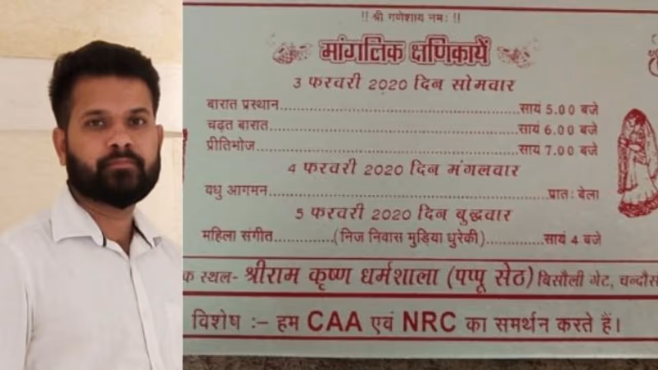 ഫെബ്രുവരി മൂന്നാം തീയതിയാണ് സോനം പഥക് എന്ന യുവതിയും മോഹിത് മിശ്രയും തമ്മിലുള്ള വിവാഹം. "ഞങ്ങൾ രണ്ടുപേരും സിഎഎ-എൻആർസിയെയും പിന്തുണയ്ക്കുന്നു. ഈ നിയമവും രജിസ്റ്ററും ഇന്ത്യയിലെ ഒരു പൗരനും എതിരല്ല. രണ്ടും ജനങ്ങളുടെ ദീർഘകാല നന്മക്കുള്ളതാണ്"- സോനം പഥക് പറഞ്ഞു.