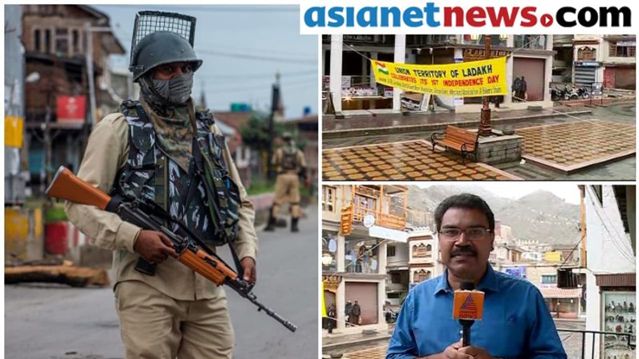 ''രാജ്യത്തെ ഏറ്റവും പുതിയ കേന്ദ്രഭരണപ്രദേശമായ ലഡാക്ക് ആദ്യ സ്വാതന്ത്ര്യദിനം ആഘോഷിച്ചു''വെന്ന് ബാനറുകൾ. ലഡാക്കിൽ സ്ഥിതി സമാധാനപരമാണ്. ഏഷ്യാനെറ്റ് ന്യൂസ് ജമ്മു കശ്മീരിൽ..