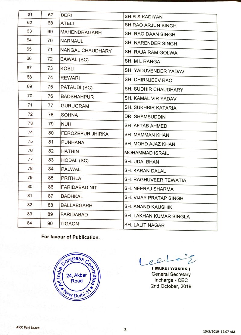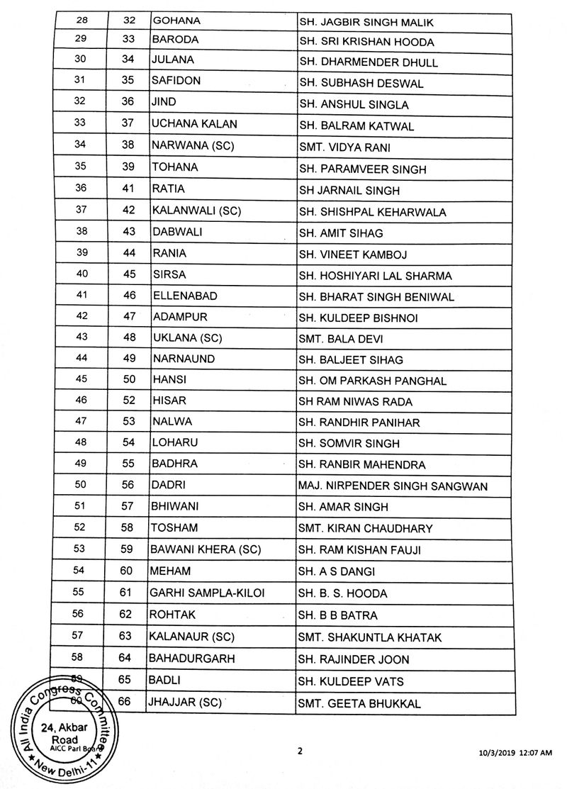 മുൻ മുഖ്യമന്ത്രി ഭൂപീന്ദർ സിംഗ് ഹൂഡ ഗർഹി സാംപ്ല കിലോയിൽ നിന്നും കോൺഗ്രസ്സ് മാധ്യമ വിഭാഗം തലവൻ രൺദീപ് സിങ് സുർജേവാല കൈത്താലിൽ നിന്നും മത്സരിക്കും. ഐഎൻഎൽഡി വിട്ട് കോൺഗ്രസിൽ ചേർന്ന അശേക് അറോറയ്ക്കും, ജെപി സിംഗിനും കോൺഗ്രസ് സീറ്റ് നൽകിയിട്ടുണ്ട്. കുൽദീപ് ബിഷ്ണോയി ആദംപൂരിൽ നിന്ന് ജനവിധി തേടും. മുൻ മുഖ്യമന്ത്രി ഭജൻ ലാലിന്റെ മകൻ ചന്ദർ മോഹനും സീറ്റ് നൽകിയിട്ടുണ്ട്.