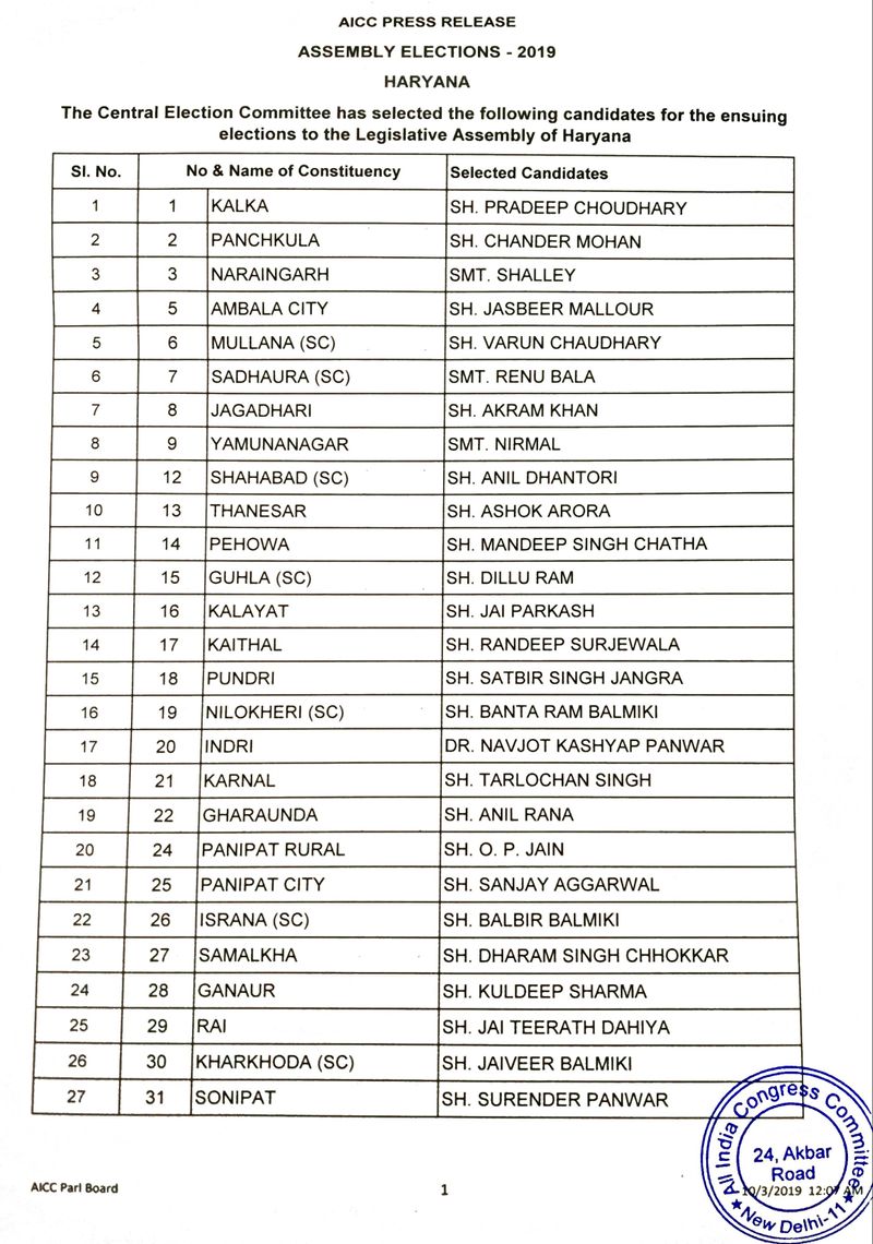 നിലവിലെ 17 എംഎൽഎമാരിൽ 16 പേർക്കും കോൺഗ്രസ് സീറ്റ് നൽകിയിട്ടുണ്ട്. കോൺഗ്രസ്സ് മാധ്യമ വിഭാഗം തലവൻ രൺദീപ് സിങ് സുർജേവാല കൈത്താലിൽ നിന്നും മത്സരിക്കും.