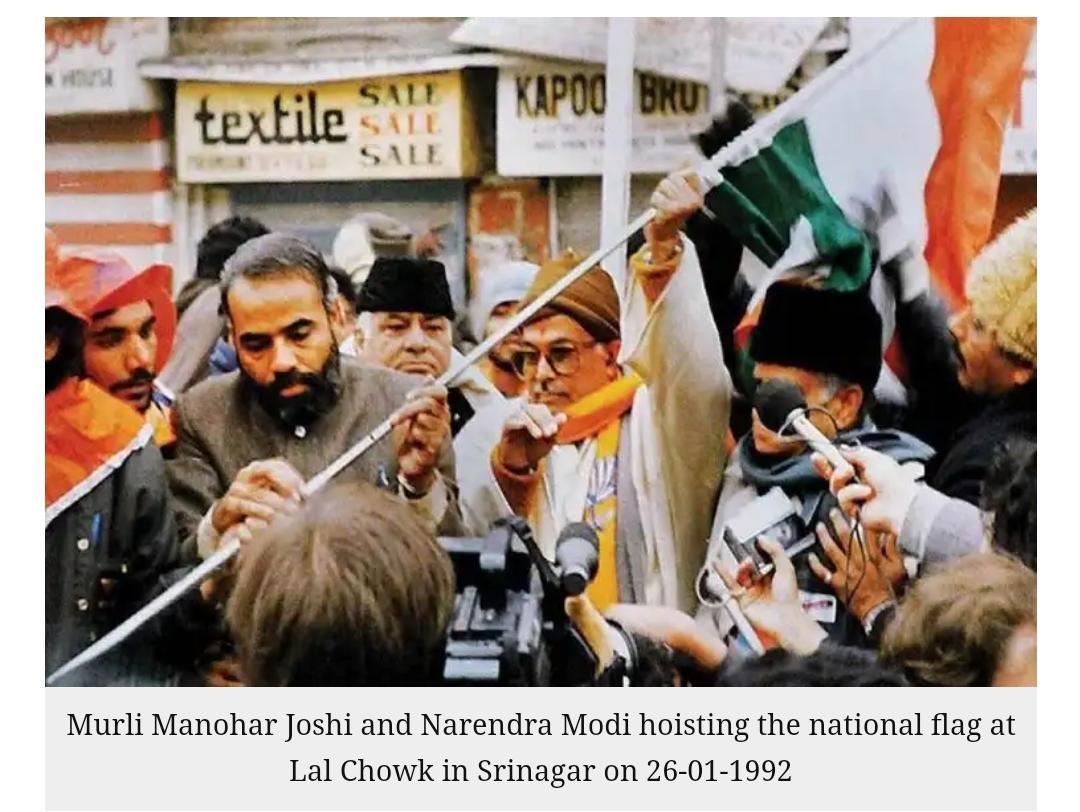 ലാൽചൗക്കിൽ ബിജെപി പതാക ഉയർത്തി ഇരുപത്തിയേഴാം വർഷത്തിൽ ജമ്മു കശ്മീരിന്റെ പ്രത്യേക പദവി എടുത്തുകളയാൻ ബിജെപിക്ക് കഴിഞ്ഞിരിക്കുന്നു. അന്ന് നിർണായക ശക്തിയായിരുന്നില്ല ബിജെപിയെങ്കിൽ ഇന്ന് തുടർച്ചയായി രണ്ട് തവണ അധികാരത്തിലെത്തിയ സുപ്രധാനമായ രാഷ്ട്രീയ ശക്തിയാണ് ഈ പാർട്ടി.