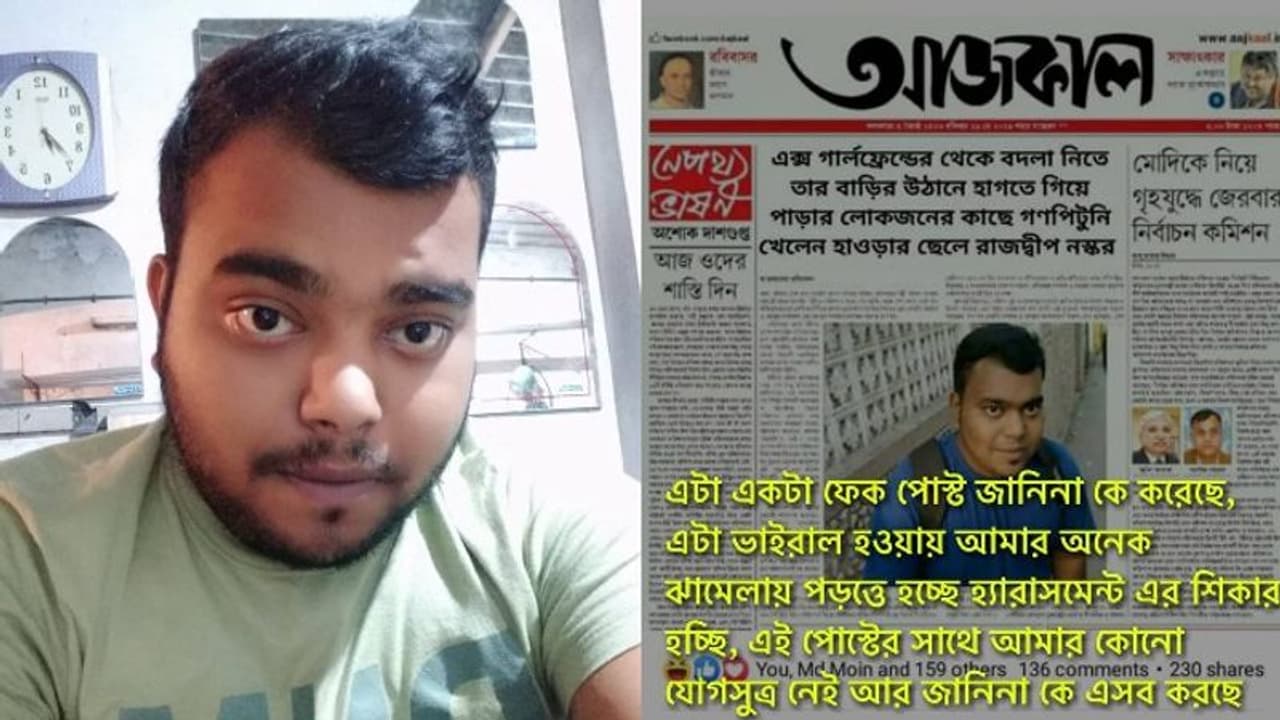 കൊൽക്കത്ത: സുഹൃത്തിനെ കളിയാക്കാൻ തമാശയ്ക്ക് ഉണ്ടാക്കിയ മെമിയെ ചൊല്ലി പൊല്ലാപ്പ് പിടിച്ചിരിക്കുകയാണ് ബംഗാൾ സ്വദേശിയായ രാജ്ദീപ് നസ്കര്. കൈവിട്ട മെമി വ്യാജവാര്ത്തയായി സമൂഹമാധ്യമങ്ങളിലാകെ വൈറലായതോടെ രാജ്ദീപും സുഹൃത്തുക്കളും വിശദീകരണം നൽകി വലഞ്ഞു.