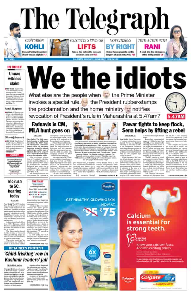 കുറിക്ക് കൊള്ളുന്ന തലക്കെട്ടുകളുടെ ആശാൻമാരായ, ദ് ടെലഗ്രാഫ് ദിനപ്പത്രം പതിവ് തെറ്റിച്ചതേയില്ല. 'നമ്മൾ വിഡ്ഢികൾ' എന്ന് - 'വീ ദ് ഇഡിയറ്റ്സ്' എന്ന്, 'വീ ദ് പീപ്പിൾ ഓഫ് ഇന്ത്യ' എന്ന ഭരണഘടനയുടെ ആദ്യ വാചകം തിരുത്തിയെഴുതി തലക്കെട്ടാക്കി ദ് ടെലഗ്രാഫ്.