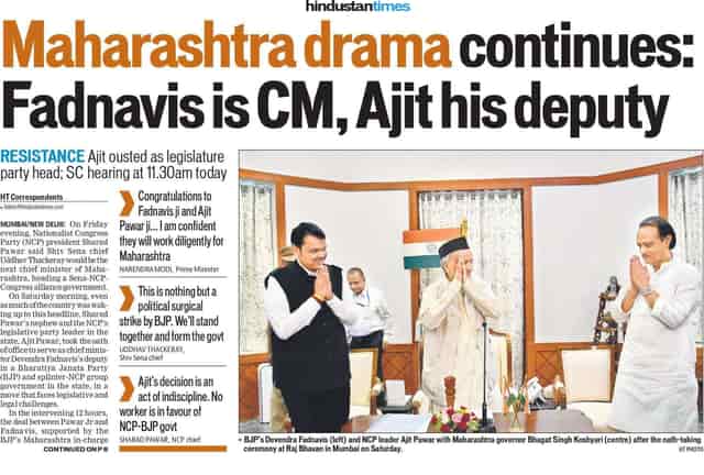 ഹിന്ദുസ്ഥാൻ ടൈംസ് തലക്കെട്ട് വളരെ കരുതലോടെയായിരുന്നു. മഹാരാഷ്ട്ര നാടകം തുടരുന്നു, ഫട്നവിസ് മുഖ്യമന്ത്രി, അജിത് ഡെപ്യൂട്ടി എന്ന് മാത്രം.
