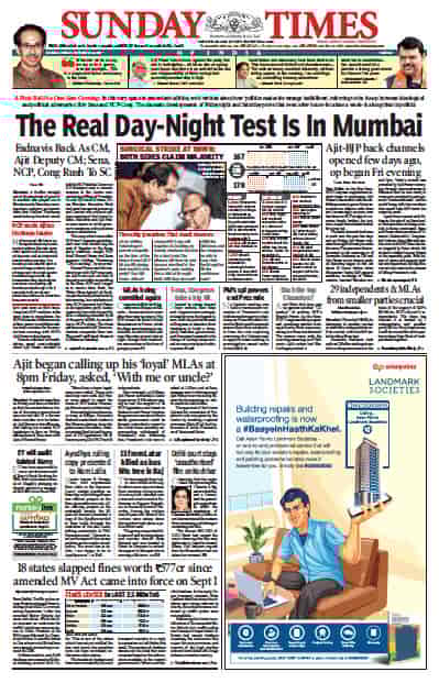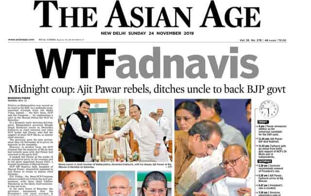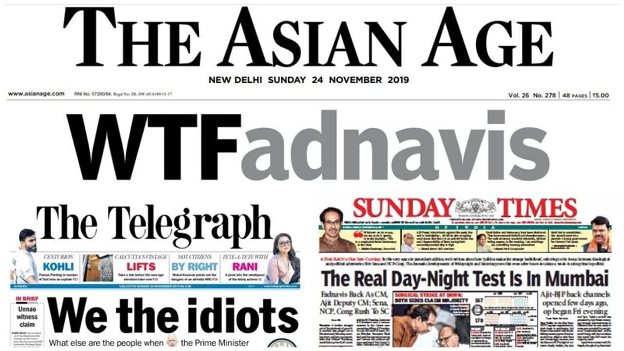 'നിങ്ങളുറങ്ങുമ്പോൾ', എന്നൊരു തലക്കെട്ടിൽ ഇന്ത്യൻ എക്സ്പ്രസ് വാർത്തയെത്തിച്ചു. മഹാരാഷ്ട്ര ഉണർന്നത്, ഫട്നാവിസ് മുഖ്യമന്ത്രിയായതിലേക്ക് എന്ന് പറഞ്ഞ്, സംഭവങ്ങളുടെ പ്രധാന വിവരങ്ങളും പ്രതിപക്ഷത്തിന്റെ വിമർശനങ്ങളുമെല്ലാം ആദ്യത്തെ പേജിൽ ആദ്യ ഭാഗത്ത് ഒതുക്കിയ ഇന്ത്യൻ എക്സ്പ്രസ്, അജിത് പവാർ എങ്ങനെയാണ്, അഴിമതിക്കേസുകളിൽ പെട്ട് ബിജെപിയുടെ ഉന്നമായിരുന്നതെന്ന്, ഒരു റിപ്പോർട്ട് ഒളിയമ്പുമായി ആദ്യപേജിന് കീഴെ.