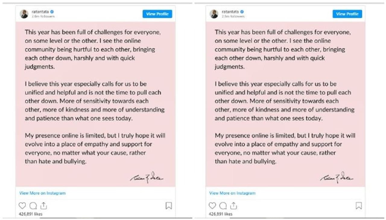 'എല്ലാവര്ക്കും ഒരുപാട് വെല്ലുവിളികള് നിറഞ്ഞതാണ് ഈ വര്ഷം. വെല്ലുവിളിയുടെ തോതില് ചെറിയ വ്യത്യാസം ഉണ്ടായെന്ന് വരാം. പരസ്പരം വേദനിപ്പിക്കുകയും അടുത്തയാളെ വലിച്ച് താഴെയിടാനുള്ള പ്രവണതയുമാണ് ഓണ്ലൈനുകളില് വ്യാപകമായി കാണുന്നത്. ഓണ്ലൈനില് വളരെ പെട്ടന്ന് തീരുമാനങ്ങളിലെത്തിയാണ് ഇത്തരം രീതികളില് ആളുകള് പെരുമാറുന്നത്. ഒരുമിച്ച് നിന്ന് അടുത്തുള്ളവരെ സഹായിച്ച് അവരെ ഉയര്ന്ന വരാന് കൈനീട്ടി നല്കേണ്ട സമയമാണ് ഇത്. ചുറ്റുമുള്ളവരോടെ കരുണയോടും സഹാനുഭൂതിയോടെയും ക്ഷമയോടും കൂടി ചുറ്റുമുള്ളവരെ മനസ്സിലാക്കാന് ഓണ്ലൈന് സംവിധാനങ്ങള് ഉപയോഗിക്കണം. ഓണ്ലൈന് ഇടങ്ങളില് തന്റെ സാന്നിധ്യം പരിമിതമാണ്. പക്ഷേ ഇവിടം എല്ലാവരോടും സമാനുഭവത്തോടെ ഇടപഴകുമെന്നാണ് തന്റെ പ്രതീക്ഷ. പഴിചാരലും പരിഹാസങ്ങളും മുറിവേല്പ്പിക്കലും വിദ്വേഷവും അവസാനിപ്പിക്കണ്ട സമയമായി' എന്നും രത്തന് ടാറ്റ ഇന്സ്റ്റഗ്രാം കുറിപ്പില് ആവശ്യപ്പെടുന്നു.