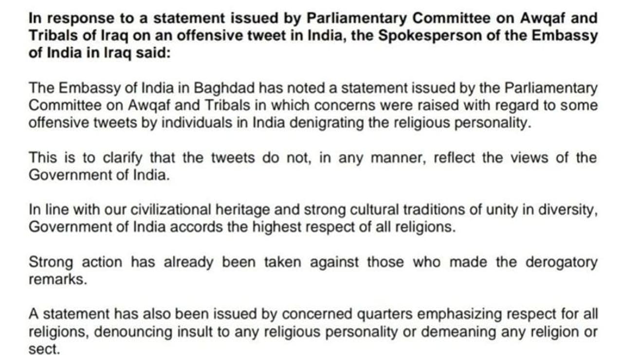 മഹത്തായ പൈതൃകം ഉള്ള ഇന്ത്യ എല്ലാ മതങ്ങളെയും ഒരുപോലെയാണ് കാണുന്നതെന്ന് ഇന്ത്യൻ എംബസി, വിശദീകരണം ഇറാഖ് പാർലമെന്റ് നബിവിരുദ്ധ പരാമർശത്തെ അപലപിച്ചതിന് പിന്നാലെ