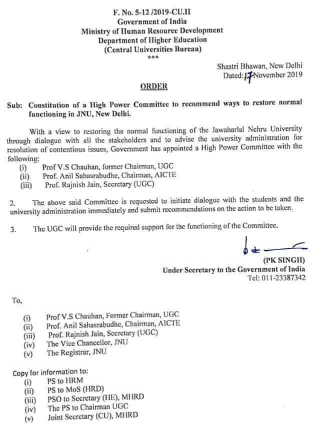 യുജിസി മുൻ ചെയർമാൻ പ്രൊഫ. വി എസ് ചൗഹാൻ, എഐസിടിഇ ചെയർമാൻ പ്രൊഫ. അനിൽ സഹസ്രബുദ്ധെ, യുജിസി സെക്രട്ടറി പ്രൊഫസർ രജനീഷ് ജയിൻ എന്നിവരാണ് ഉന്നതാധികാരസമിതി അംഗങ്ങൾ. നാളെ മാനവവിഭവശേഷി മന്ത്രാലയത്തിൽ വച്ച് നടക്കുന്ന ചർച്ചയിൽ പങ്കെടുക്കണമെന്ന് ജെഎൻയുഎസ്യു ചെയർമാൻ ഐഷി ഘോഷിന് ക്ഷണം ലഭിച്ചിട്ടുണ്ട്.