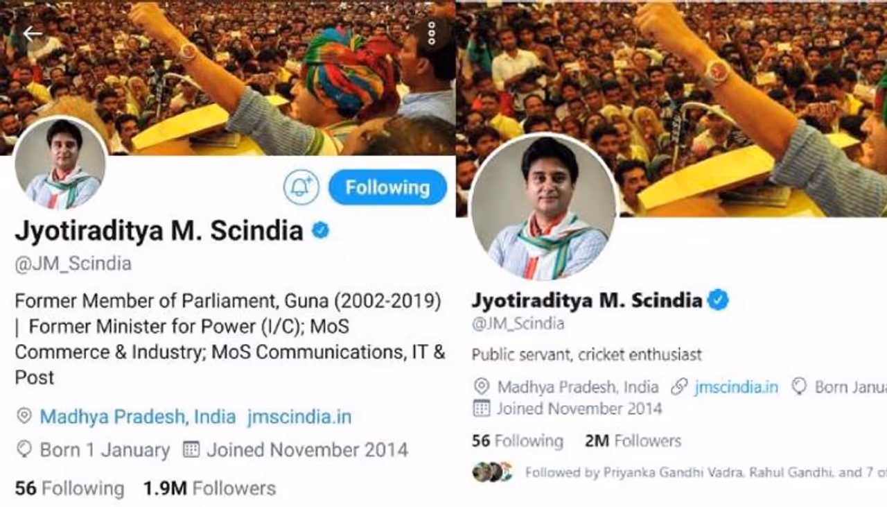 ട്വിറ്റര് ബയോയിൽ ചേർത്തിരുന്ന ഗുണ മണ്ഡലത്തില് നിന്നുള്ള മുന് പാര്ലമെന്റ് അംഗം, വൈദ്യുത മന്ത്രി എന്നീ വിവരങ്ങളാണ് ജ്യോതിരാദിത്യ സിന്ധ്യ ട്വിറ്ററില്നിന്ന് നീക്കിയത്.