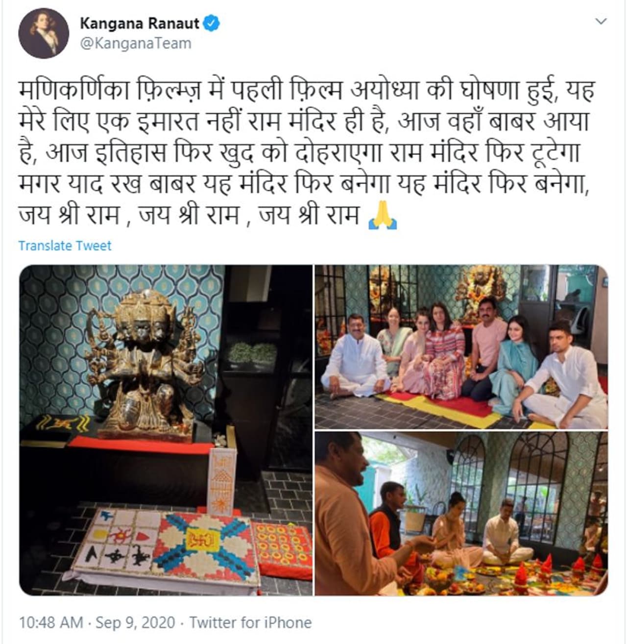 ഓഫീസ് പൊളിക്കാനെത്തിയ മുംബൈ കോര്പ്പറേഷന് അധികൃതരെ ബാബര് ആര്മിയായി ചിത്രീകരിച്ചാണ് കങ്കണയുടെ ട്വീറ്റ്