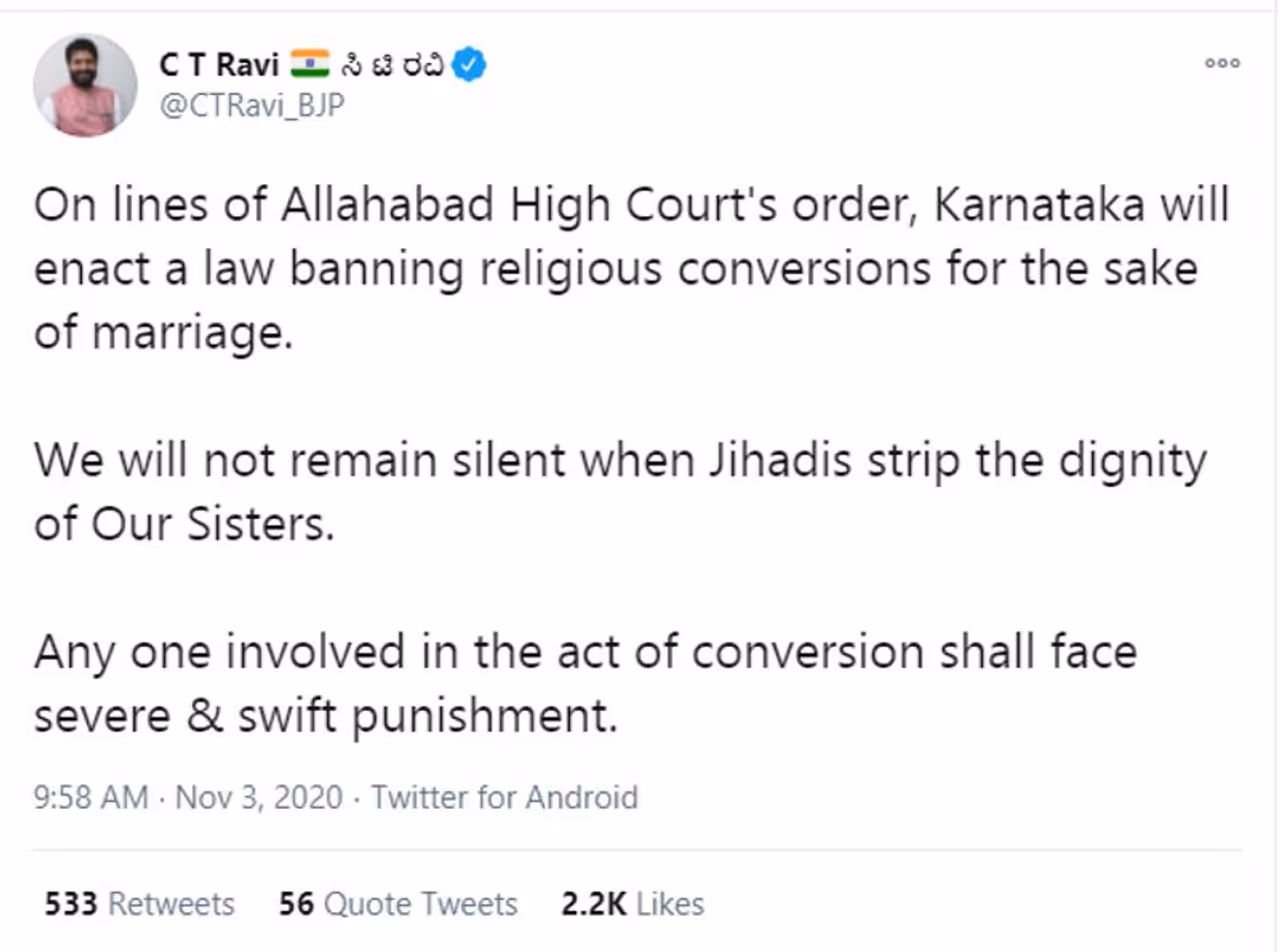 'അലഹബാദ് ഹൈക്കോടതി വിധിയുടെ അടിസ്ഥാനത്തില് കര്ണാടക വിവാഹത്തിനായി മതപരിവര്ത്തനം നടത്തുന്നത് നിരോധിക്കാനുള്ള നിയമം കൊണ്ടുവരും. ജിഹാദികള് ഞങ്ങളുടെ സഹോദരിമാരുടെ ആത്മാഭിമാനം തകര്ക്കുന്നതിനോട് തുടര്ന്നും മൗനം പാലിക്കാന് കഴിയില്ല. മതപരിവര്ത്തിന്റെ ഭാഗമാകുന്നവര് കര്ശന നടപടികള് നേരിടേണ്ടിവരും' എന്നും സിടി രവി ട്വീറ്റില് പറയുന്നു. ദക്ഷിണേന്ത്യന് സംസ്ഥാനങ്ങളുടെ ചുമതലയുള്ള ജനറല് സെക്രട്ടറിയാണ് സിടി രവി.