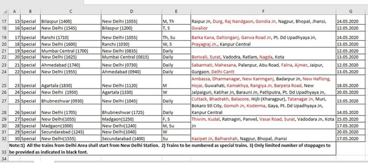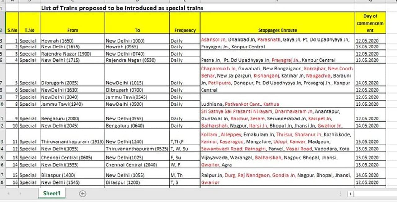 ദില്ലി–തിരുവനന്തപുരം സ്പെഷ്യൽ ട്രെയിൻ ചൊവ്വ, ബുധൻ, ഞായർ ദിവസങ്ങളിലും തിരുവനന്തപുരം–ദില്ലി ട്രെയിനുകൾ ചൊവ്വ, വ്യാഴം, വെളളി ദിവസങ്ങളിലും സർവീസ് നടത്താനാണ് ആലോചന. ദില്ലിയിൽ നിന്നുളള ആദ്യ ട്രെയിൻ 13 നും തിരുവനന്തപുരത്ത് നിന്നുളള ആദ്യ ട്രെയിൻ 15 നും സർവീസ് നടത്തുമെന്നാണ് സൂചന. ഹൗറ, രാജേന്ദ്രനഗർ, ദിബ്രുഗഡ്, ജമ്മുതാവി, ബിലാസ്പുർ, റാഞ്ചി, മുംബൈ, അഹമ്മദാബാദ്, അഗർത്തല, ഭുവനേശ്വർ, മഡ്ഗാവ്, സെക്കന്തരബാദ് എന്നിവടങ്ങളിൽ നിന്നും ദില്ലിയിലേക്കും തിരിച്ചും സ്പെഷ്യൽ ട്രെയിനുകളുണ്ട്.