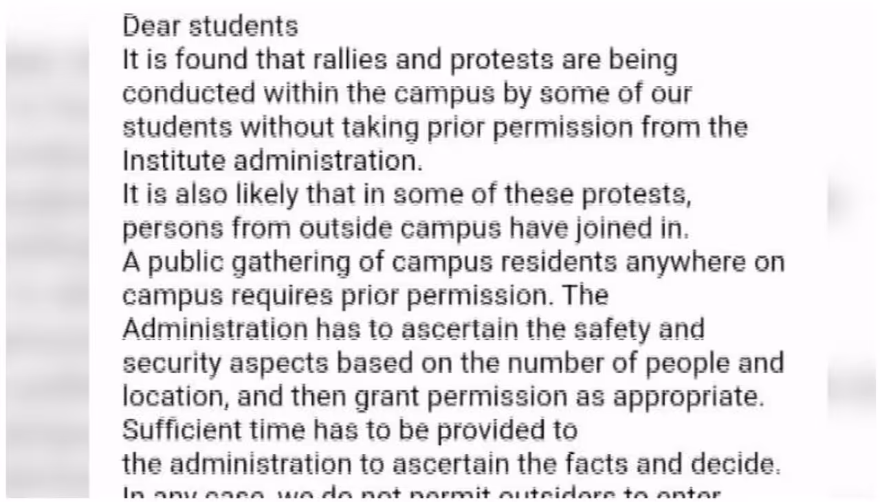 വിദ്യാർത്ഥികളെ നിരീക്ഷിക്കുന്നുണ്ടെന്നും കർശന നടപടി ഉണ്ടാകുമെന്നും മദ്രാസ് ഐഐടി ഡീന് വിദ്യാർത്ഥികൾക്ക് താക്കീത് നൽകി. ഇ മെയിലൂടെയാണ് ഭീഷണി.