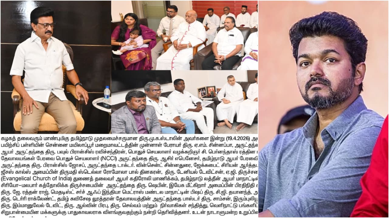 നടൻ വിജയ് ക്രിസ്ത്യൻ വോട്ടുകളിലേക്ക് കടന്നുകയറുമെന്ന റിപ്പോർട്ടുകൾക്കിടെ, മുഖ്യമന്ത്രി എം കെ സ്റ്റാലിന് പിന്തുണയുമായി തമിഴ്നാട്ടിലെ വിവിധ സഭകളിലെ ബിഷപ്പുമാർ രംഗത്തെത്തി. സ്റ്റാലിന്റെ വസതിയിലെത്തിയാണ് ബിഷപ്പുമാരുടെ സംഘം പിന്തുണയറിയിച്ചത്. അതേസമയം, സ്റ്റാലിനും വിജയ്യും നാമനിർദേശ പത്രിക സമർപ്പിച്ച് തിരഞ്ഞെടുപ്പ് പ്രചാരണം ശക്തമാക്കി.