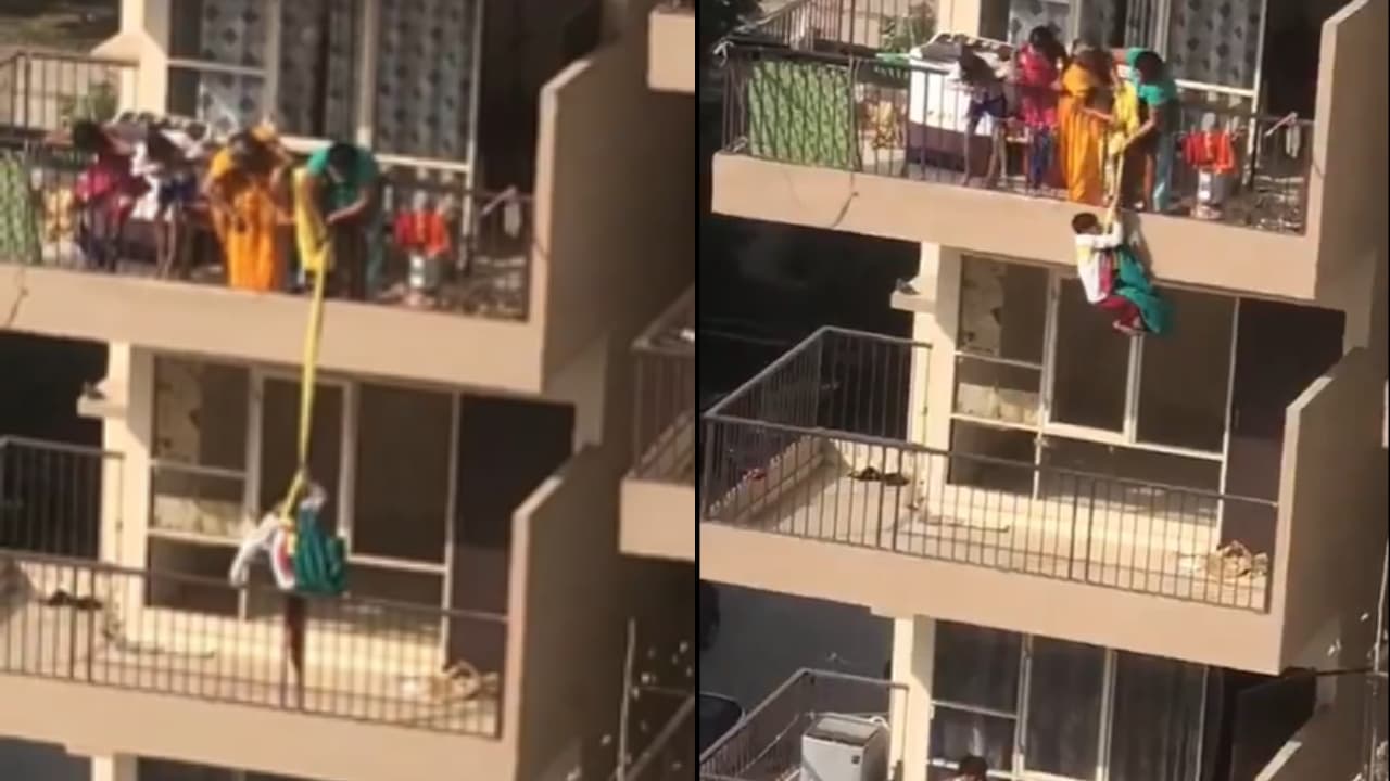 ഫരീദാബാദ് സെക്ടർ 82-ലെ ഗ്രാൻഡുറ സൊസൈറ്റിയിലാണ് സംഭവം. ഫ്ലാറ്റിന് താഴെയുള്ള ബാൽക്കണിയിൽ സാരി വീണതിനെത്തുടർന്നാണ് സ്ത്രീ ഈ അപകടകരമായ നീക്കം നടത്തിയത്. ഒരൊറ്റ തുണി കൊണ്ട് വസ്ത്രമെടുക്കാൻ കഴിയില്ലെന്ന് കണ്ടപ്പോൾ, വീട്ടിലുണ്ടായിരുന്ന സാരികൾ കൂട്ടിക്കെട്ടി ഒരു നീളൻ കയർ രൂപത്തിലാക്കി. സാരിയുടെ ഒരറ്റം മകന്റെ അരയിൽ കെട്ടിയ ശേഷം ബാൽക്കണിയിലൂടെ താഴേക്ക് ഇറക്കി. കുട്ടി താഴത്തെ നിലയിൽ നിന്ന് വസ്ത്രം കൈക്കലാക്കിയ ശേഷം, സാരിയിൽ മുറുകെ പിടിക്കുകയും അമ്മ കുട്ടിയെ മുകളിലേക്ക് വലിച്ചു കയറ്റുകയുമായിരുന്നു.