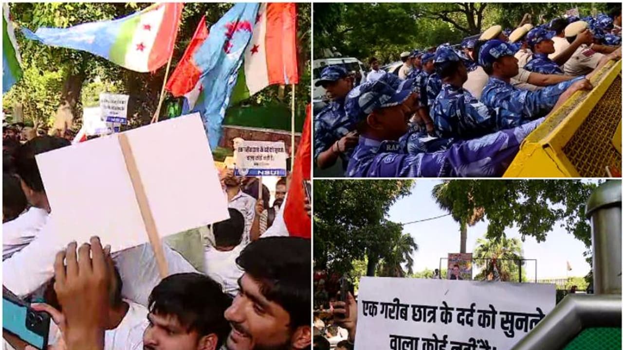 ദില്ലി: നീറ്റ് പരീക്ഷയുമായി ബന്ധപ്പെട്ട് ഉയർന്ന വിവാദത്തിൽ ഇന്ന് സത്യപ്രതിജ്ഞ നടക്കാനിരിക്കെ ദില്ലിയിൽ പ്രതിഷേധവുമായി യൂത്ത് കോൺഗ്രസ്. എൻഎസ്യുഐ ആണ് പ്രതിഷേധം സംഘടിപ്പിക്കുന്നത്. ദില്ലിയിലെ യൂത്ത് കോൺഗ്രസ് ആസ്ഥാനത്തിന് മുന്നിലാണ് പ്രതിഷേധം. അതേസമയം, പ്രതിഷേധവുമായി എത്തിയ പ്രവർത്തകരെ പൊലീസ് ബാരിക്കേഡ് വച്ച് തടഞ്ഞു. പ്രതിഷേധത്തിന്റെ പശ്ചാത്തലത്തിൽ സ്ഥലത്ത് കേന്ദ്ര സേനയെ വിന്യസിച്ചിട്ടുണ്ട്. ബാരിക്കേഡ് മുകളിൽ കയറി നിന്നുകൊണ്ട് പ്രതിഷേധിച്ച പ്രവർത്തകരെ അറസ്റ്റ് ചെയ്തു നീക്കി.