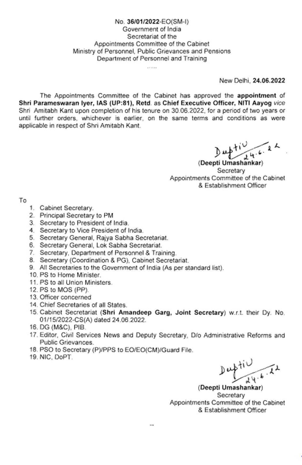 നിലവിലെ സിഇഒ അമിതാഭ് കാന്ത് ഈ മാസം 30 ന് വിരമിക്കുന്ന ഒഴിവിലേക്കാണ് നിയമനം.