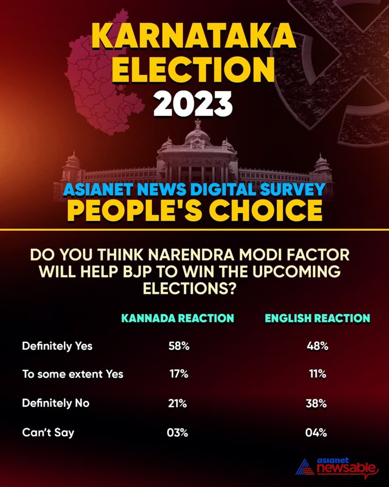 വോട്ടുകളെ നിയന്ത്രിക്കുന്നതില് നിര്ണായക പങ്ക് വഹിക്കുക സംവരണത്തിനാകുമെന്ന് കന്നഡ സംസാരിക്കുന്ന 75 ശതമാനം പേരും ഇംഗ്ലീഷ് സംസാരിക്കുന്ന 58 ശതമാനം പേരും വിലയിരുത്തുന്നത്. അഴിമതിയുടെ കാര്യത്തില് എല്ലാ സംസ്ഥാനത്തെ സര്ക്കാരുകളും ഒരേ പോലെ ആണെന്നെന്നാണ് സര്വ്വേയില് പങ്കെടുത്തവര് പ്രതികരിക്കുന്നത്. എന്നാല് നിലവിലെ ബൊമ്മൈ സര്ക്കാര് മുന് സര്ക്കാരിനേക്കാള് അഴിമതിയില് മുങ്ങിയവരാണെന്ന് വിശ്വസിക്കുന്നത് സര്വേയില് പങ്കെടുത്ത 19 ശതമാനം പേരാണ്.