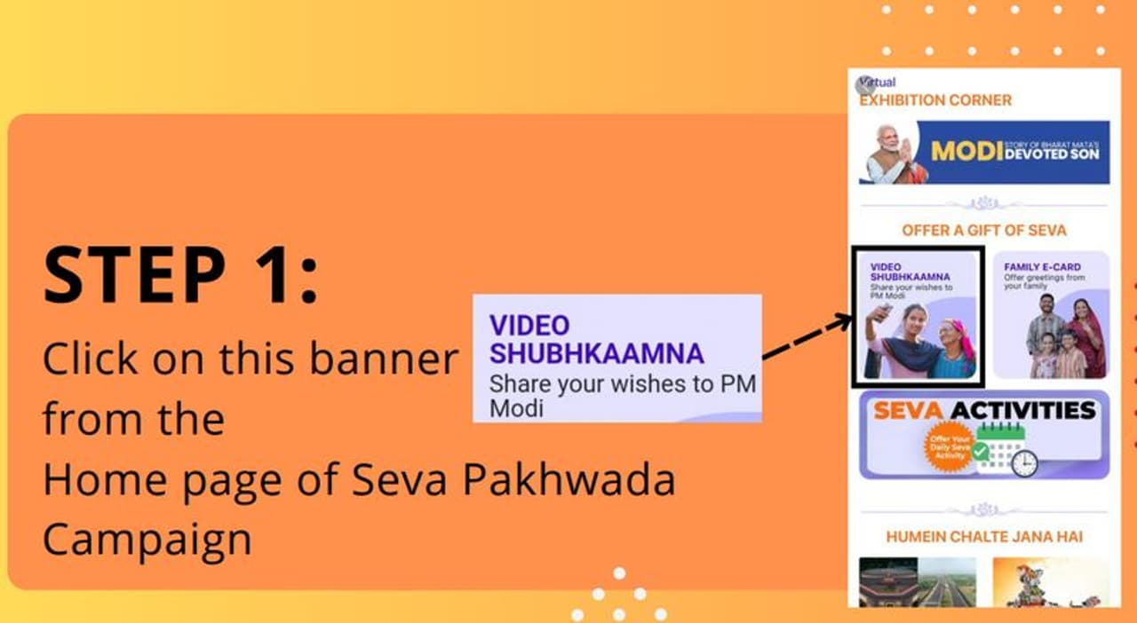 പ്രധാനമന്ത്രി നരേന്ദ്ര മോദിയുടെ ജന്മദിനത്തില് മുന് വര്ഷങ്ങളില് സാമൂഹ്യമാധ്യമങ്ങളില് വലിയ ആശംസാ പ്രവാഹമായിരുന്നു. ഇത്തവണ ഇത് വ്യത്യസ്തമാക്കുന്നതിന്റെ ഭാഗമായാണ് വീഡിയോ ആശംസാ ക്യംപയിനുമായി ബിജെപി രംഗത്തെത്തിയിരിക്കുന്നത്. https://nm-4.com/VideoShubhkaamna എന്ന ലിങ്കില് ക്ലിക്ക് ചെയ്താല് നമോ ആപ്പില് പ്രവേശിക്കാം. നമോ ആപ്പില് പ്രവേശിച്ച ശേഷം വീഡിയോ ശുഭ്കാമ്ന (Video Shubhkaamna) എന്നെഴുതിയിരിക്കുന്ന ബാനറില് ആദ്യം ക്ലിക്ക് ചെയ്യുക. തുറന്നുവരുന്ന വെബ് പേജില് അപ്ലോഡ് വീഡിയോ ഓപ്ഷന് തെരഞ്ഞെടുക്കുക. നിങ്ങള്ക്ക് തല്സമയം ആശംസാ വീഡിയോ റെക്കോര്ഡ് ചെയ്യാനായി വീഡിയോ ക്യാമറ ഇപ്പോള് ഓപ്പണായി വരും. വീഡിയോ ഷൂട്ട് ചെയ്ത ശേഷം നെക്സ്റ്റ് ഓപ്ഷന് തെരഞ്ഞെടുക്കുക.