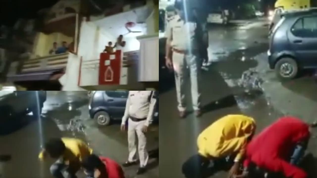 നടുറോഡില് രണ്ടു പ്രതികളെ കൊണ്ട് ഏത്തമിടീക്കുന്നതാണ് വീഡിയോയിലുളളത്. തുടര്ന്ന് നിലത്ത് മുട്ടുകുത്തി ഇരുന്ന് റോഡില് തലതാഴ്ത്തി പ്രതികള് മാപ്പു ചോദിക്കുന്നുമുണ്ട്. വാർത്താ ഏജൻസിയായ എഎൻഐ ആണ് സംഭവത്തിന്റെ വീഡിയോ പങ്കുവച്ചിരിക്കുന്നത്. റോഡില് മഴ പെയ്ത് വെളളം കെട്ടിനില്ക്കുന്നതും ദൃശ്യങ്ങളില് കാണാം.