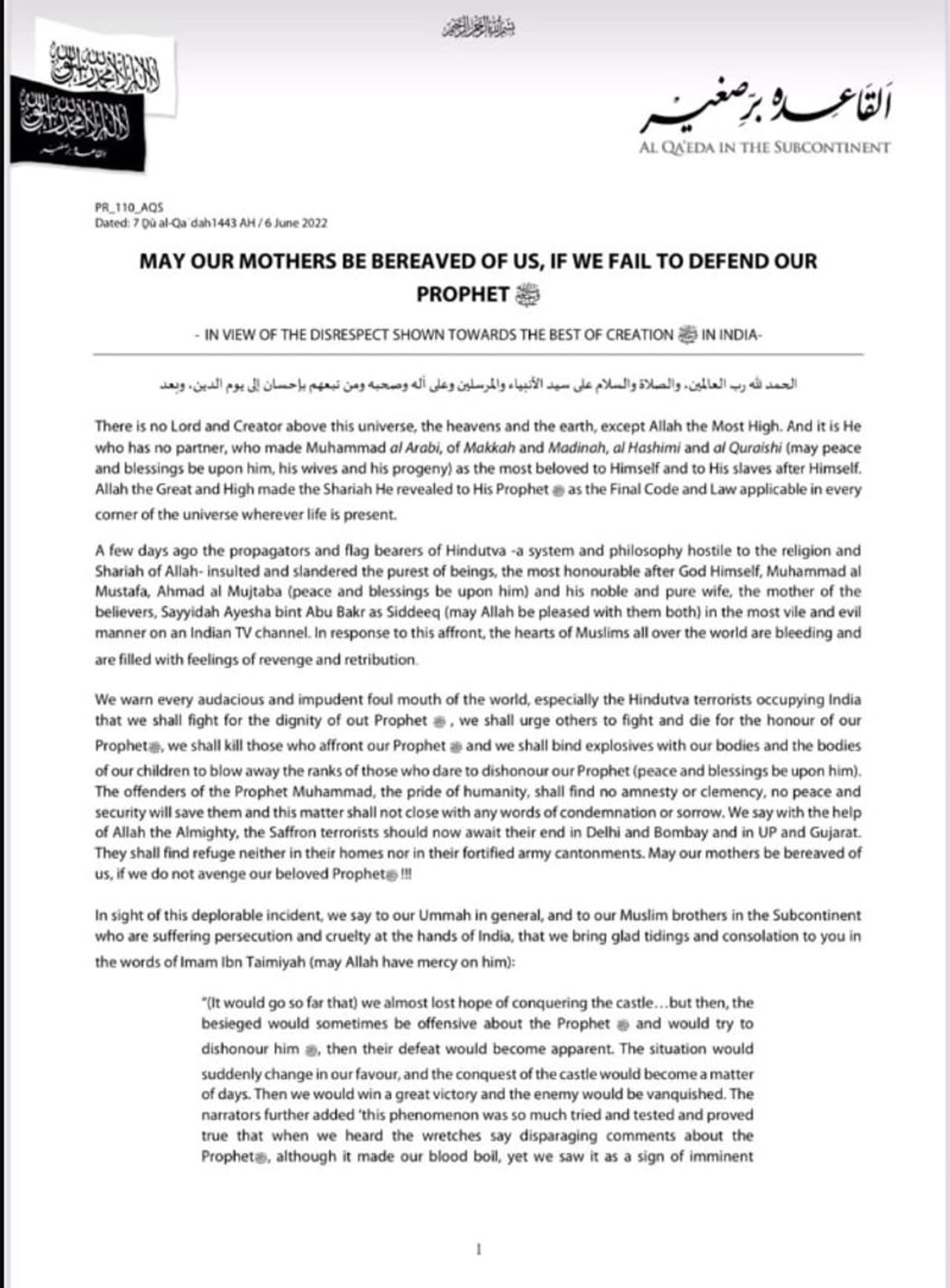 നബി വിരുദ്ധ പ്രസ്താവനയ്ക്കെതിരെ 'പ്രവാചകന്റെ മഹത്വത്തിനായി പോരാടുന്നതിനായി' ചാവേർ ആക്രമണം നടത്തുമെന്നാണ് ഭീഷണിക്കത്തിൽ വ്യക്തമാക്കിയിട്ടുള്ളത്. ദില്ലി, മുംബൈ, ഉത്തർപ്രദേശ്, ഗുജറാത്ത് എന്നിവിടങ്ങളിൽ ചാവേർ ആക്രമണം നടത്തുമെന്നാണ് കത്തിൽ പറയുന്നത്