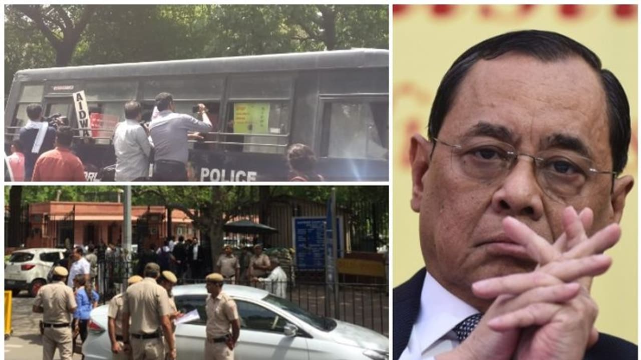 ദില്ലി: സുപ്രീം കോടതിക്ക് മുന്നിൽ വനിതാ കൂട്ടായ്മയുടെ പ്രതിഷേധത്തെത്തുടർന്ന് കോടതിയുടെ ഒരു കിലോമീറ്റർ ചുറ്റളവിൽ നിരോധനാജ്ഞ പ്രഖ്യാപിച്ചു. സുപ്രീം കോടതി ചീഫ് ജസ്റ്റിസ് രഞ്ജൻ ഗൊഗോയ്ക്കെതിരെ ഉയര്ന്ന ലൈംഗിക പീഡനപരാതി തള്ളിയ സാഹചര്യത്തിലാണ് വനിതാ കൂട്ടായ്മ പ്രതിഷേധവുമായി എത്തിയത്. ഇതേത്തുടർന്ന് ഇരുപത്തിയഞ്ചോളം പേരെ സുപ്രീംകോടതിയ്ക്ക് മുന്നിൽ നിന്ന് അറസ്റ്റ് ചെയ്ത് നീക്കി. സുപ്രീംകോടതിയ്ക്ക് പുറത്ത് സുരക്ഷ കർശനമാക്കിയിട്ടുണ്ട്.