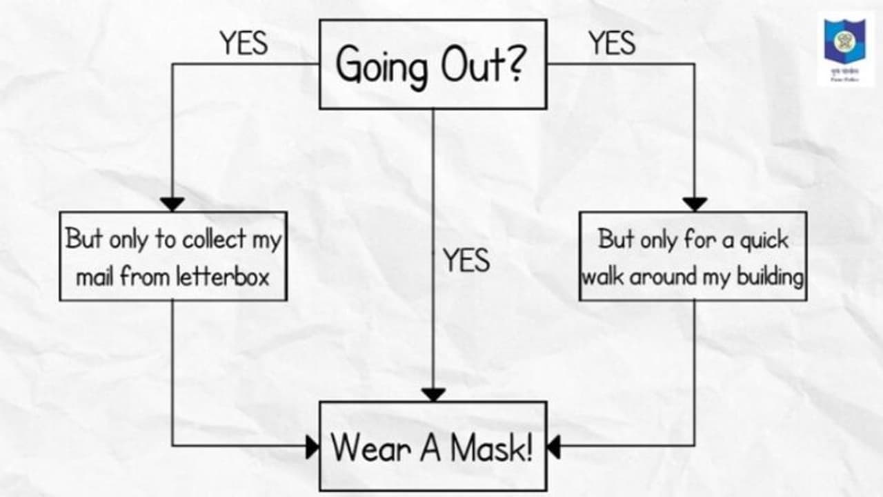 പുറത്തുപോകുകയാണോ? ഗേറ്റ് വരെ മാത്രമാണോ പോകുന്നത്? എന്നാലും മാസ്ക് ധരിക്കണം! കെട്ടിടത്തിന് ചുറ്റും മാത്രമാണോ നടക്കുന്നത് ? എന്നാലും മാസ്ക് ധരിക്കണം! എന്ന് വ്യക്തമാക്കുന്ന രസകരമായ ചാര്ട്ടാണ് പോസ്റ്റ് ചെയ്തിരിക്കുന്നത്. ഇത് വ്യക്തമാക്കുന്ന ഫ്ളോ ചാര്ട്ട് പൊലീസ് സോഷ്യല് മീഡിയയിലൂടെ പങ്കുവച്ചു.