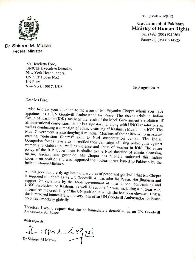 'കശ്മീര് വിഷയത്തില് ഇന്ത്യ സ്വീകരിക്കുന്ന നിലപാടിനെയും ഇന്ത്യന് പ്രതിരോധമന്ത്രി പാകിസ്ഥാനെതിരെ നടത്തിയ ആണവായുധം പ്രയോഗിക്കുമെന്ന ഭീഷണിയെയും പ്രിയങ്ക ചോപ്ര പരസ്യമായി അനുകൂലിച്ചു'. അത്തരം നിലപാടുകള് സ്വീകരിക്കുന്ന പ്രിയങ്കയെ തല്സ്ഥാനത്തുനിന്നും മാറ്റിയില്ലെങ്കില് ആഗോളതലത്തില് യുഎന് ഉയര്ത്തിപ്പിടിക്കുന്ന സമാധാനത്തിന്റെ മുഖംതന്നെ മാറുമെന്നും പാകിസ്ഥാന് മനുഷ്യാവകാശവകുപ്പ് മന്ത്രി ശിരീന് മസാരി യുണിസെഫ് അധികൃതര്ക്ക് അയച്ച കത്തില് വ്യക്തമാക്കുന്നു.