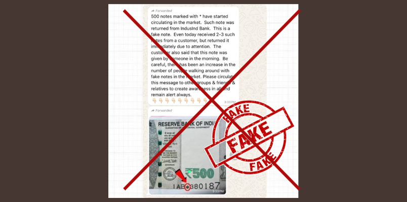 '* മാര്ക്കുള്ള 500 രൂപ നോട്ട് വിപണിയില് പ്രചരിക്കുന്നുണ്ട്. ഈ നോട്ടുകള് ഒരു ബാങ്കില് നിന്ന് റിട്ടേണ് ചെയ്യപ്പെട്ടവയാണ്. ഈ 500 രൂപ നോട്ടുകള് വ്യാജമാണ്. ഇന്ന് മാത്രം ഒരു കസ്റ്റമറില് നിന്ന് ഇത്തരം രണ്ടുമൂന്ന് നോട്ടുകള് ലഭിച്ചു. എന്നാല് ശ്രദ്ധയില്പ്പെട്ടതുകൊണ്ടുതന്നെ ഉടന് മടക്കിനല്കി. ഇന്ന് രാവിലെ ഒരാള് തന്നതാണ് ഈ നോട്ട് എന്നാണ് കസ്റ്റമര് പറഞ്ഞത്. വ്യാജ കറന്സികളുമായി നമുക്ക് ചുറ്റും കറങ്ങിനടക്കുന്ന ആളുകളുടെ എണ്ണം കൂടിയിട്ടുണ്ട്. അതിനാല് ഈ സന്ദേശം മറ്റ് ഗ്രൂപ്പുകളിലേക്കും സുഹൃത്തുക്കള്ക്കും ബന്ധുക്കള്ക്കും പങ്കുവെച്ച് നല്കുക, സമൂഹത്തില് ബോധവല്ക്കരണം നടത്തുക, എല്ലാവരും ജാഗ്രത പാലിക്കുക എന്നുമാണ് വാട്സ്ആപ്പ് ഫോര്വേഡിലുള്ളത്'.