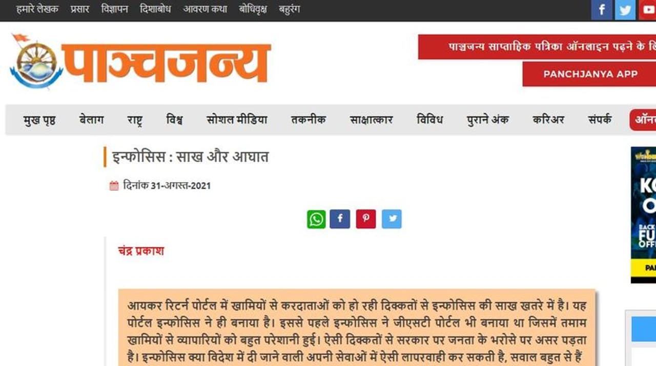 ദില്ലി: പാഞ്ചജന്യം എന്ന ഹിന്ദി വാരിക രാഷ്ട്രീയ സ്വയം സേവക് സംഘിന്റെ നിലപാടുകൾ പ്രതിഫലിപ്പിക്കുന്ന ആനുകാലികമല്ല എന്ന് ആർഎസ്എസ്. കഴിഞ്ഞയാഴ്ച ചന്ദ്രപ്രകാശ് എഴുതി പാഞ്ചജന്യം പ്രസിദ്ധീകരിച്ച 'സാഖ് ആർ ആഘാത്' - 'പ്രസിദ്ധിയും, പ്രത്യാഘാതങ്ങളും'എന്ന നാലുപേജുള്ള മുഖലേഖനത്തിൽ ആദായ നികുതി വകുപ്പിന്റെ ഈ ഫയലിംഗ് പോർട്ടൽ നടത്തിപ്പിന്റെ കരാർ എടുത്ത ഇൻഫോസിസ് പ്രകടിപ്പിച്ചത് കുറ്റകരമായ കെടുകാര്യസ്ഥതയാണ് എന്നൊരു വിമർശനം ഉയർത്തപ്പെട്ടിരുന്നു. ജൂൺ ഏഴാം തീയതി മുതൽ ലൈവ് ആയ ഈ പോർട്ടലിൽ തുടർച്ചയായ സാങ്കേതികപ്രശ്നങ്ങൾ കാരണം അടുത്ത ദിവസം മുതൽ തന്നെ നികുതിദായകരിൽ നിന്നും പരാതികൾ ഉയർന്നിരുന്നു. പോർട്ടലിൽ പലപ്പോഴും ഇ ഫയലിംഗ് നടത്താൻ പറ്റുന്നില്ല എന്നും, പ്രവർത്തിക്കുന്ന സമയത്തുതന്നെ അത് വളരെ പതുക്കെയാണ് എന്നുമായിരുന്നു പ്രധാന പരാതി.