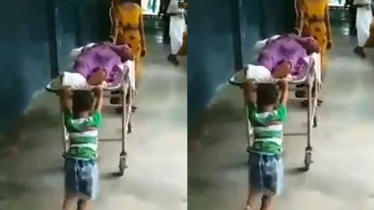 ഛേദി യാദവ് എന്നയാളുടെ കൊച്ചുമകനായ ആറ് വയസ്സുകാരനാണ് അമ്മയ്ക്കൊപ്പം സ്ട്രെച്ചർ തള്ളിയത്. അപകടത്തിൽ പരിക്കേറ്റതിനെ തുടർന്നാണ് ഇദ്ദേഹത്തെ ആശുപത്രിയിൽ പ്രവേശിപ്പിച്ചത്. മുറിവ് ഡ്രെസ് ചെയ്യാൻ സർജിക്കൽ വാർഡിൽ നിന്ന് മറ്റൊരു മുറിയിലേക്ക് ഇദ്ദേഹത്തെ ദിവസവും കൊണ്ടുപോയിരുന്നു.