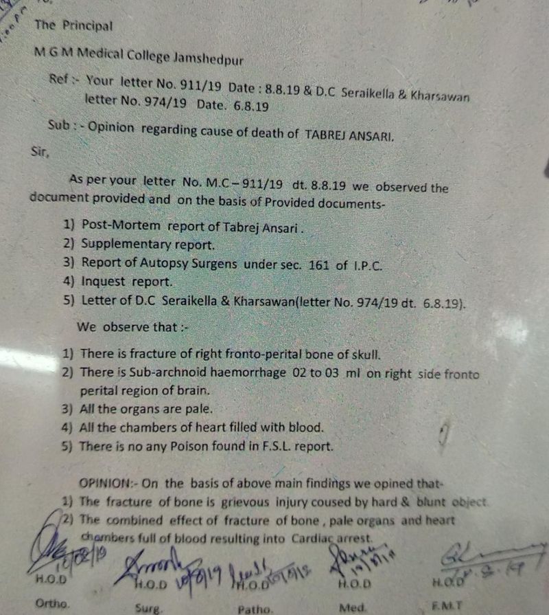 തബ്രിസ് അന്സാരിയുടെ മരണകാരണം ഹൃദയാഘാതമാണെന്ന് പോസ്റ്റ്മോര്ട്ടം റിപ്പോര്ട്ടിനെ തുടര്ന്ന് പ്രതികള്ക്കെതിരെ പൊലീസ് കൊലക്കുറ്റം ചുമത്തിയിരുന്നില്ല. മനപൂര്വമല്ലാത്ത കൊലക്കുറ്റമാണ് പ്രതികള്ക്കെതിരെ ചുമത്തിയത്. ജൂണ് 18നാണ് 24കാനായ തബ്രിസ് അന്സാരി ആള്ക്കൂട്ട മര്ദ്ദനമേറ്റ് കൊല്ലപ്പെടുന്നത്. ബൈക്ക് മോഷ്ടിച്ചെന്നാരോപിച്ച് പിടികൂടിയ സംഘം നിര്ബന്ധിച്ച് ജയ് ശ്രീറാം വിളിപ്പിക്കുകയും ക്രൂരമായി മര്ദ്ദിക്കുകയുമായിരുന്നു. കേസില് പൊലീസും ഡോക്ടര്മാരും അലംഭാവം കാട്ടിയെന്ന് ബന്ധുക്കള് ആരോപിച്ചിരുന്നു. 12 പേരെയാണ് പൊലീസ് അറസ്റ്റ് ചെയ്തത്.