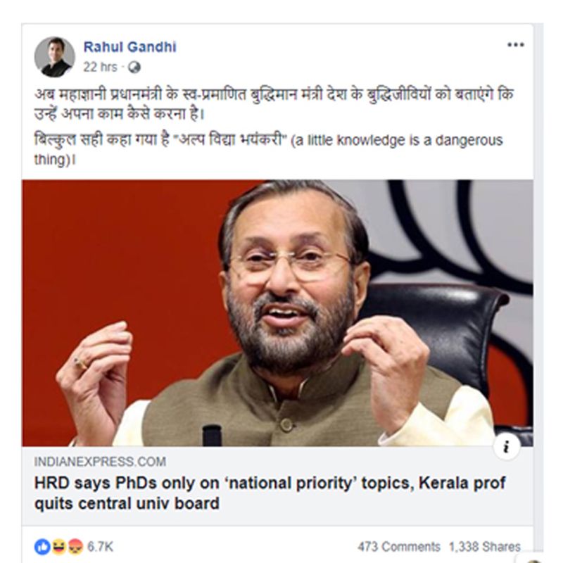 സ്വാഭാവികമായും വളരെ വ്യാപകമായ പ്രതിഷേധങ്ങളാണ് ഈ സർക്കുലർ ക്ഷണിച്ചുവരുത്തിയത്. ഈ വിഷയത്തിൽ പ്രതിഷേധം രേഖപ്പെടുത്തിക്കൊണ്ട് രാഹുൽ ഗാന്ധി തന്റെ ഫെയ്സ്ബുക്ക് പ്രൊഫൈലിൽ ഹിന്ദിയിൽ പോസ്റ്റിട്ടു. ഇതായിരുന്നു ആ പോസ്റ്റിന്റെ സാരാംശം, " മഹാജ്ഞാനിയായ പ്രധാനമന്ത്രിയും, സ്വയം പ്രഖ്യാപിത ബുദ്ധിജീവിയായ അദ്ദേഹത്തിന്റെ HRD മിനിസ്റ്ററും ചേർന്ന് ഇന്നുമുതൽ രാജ്യത്തെ ഗവേഷകരെ ഉപദേശിക്കുമത്രേ.. അവർ എന്തൊക്കെ ചിന്തിക്കണമെന്നും.. ഗവേഷണം നടത്തണമെന്നും.. ചുമ്മാതല്ല പഴമക്കാർ പറഞ്ഞിട്ടുള്ളത്, " അല്പജ്ഞാനം ആപത്ത്..".
