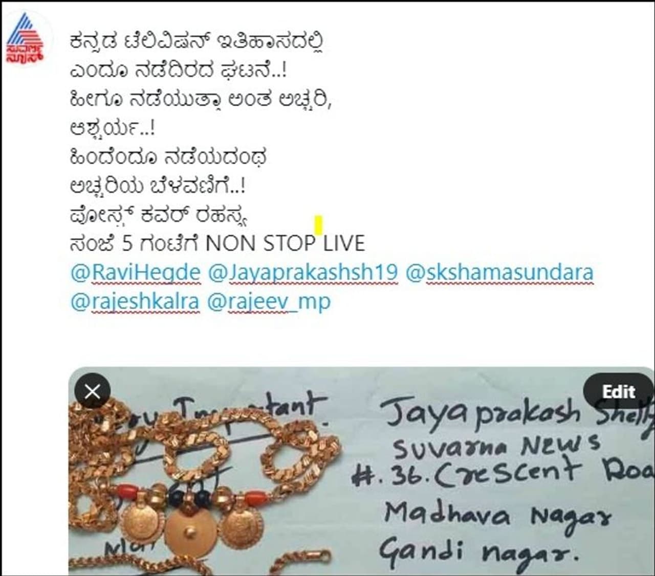 സുവർണാ ന്യൂസിലെ അവതാരകനായ ജയപ്രകാശ് ഷെട്ടിയുടെ വിലാസത്തിലാണ് മോഷ്ടാവ് മാല ആയച്ച് കൊടുത്തിരിക്കുന്നത്.