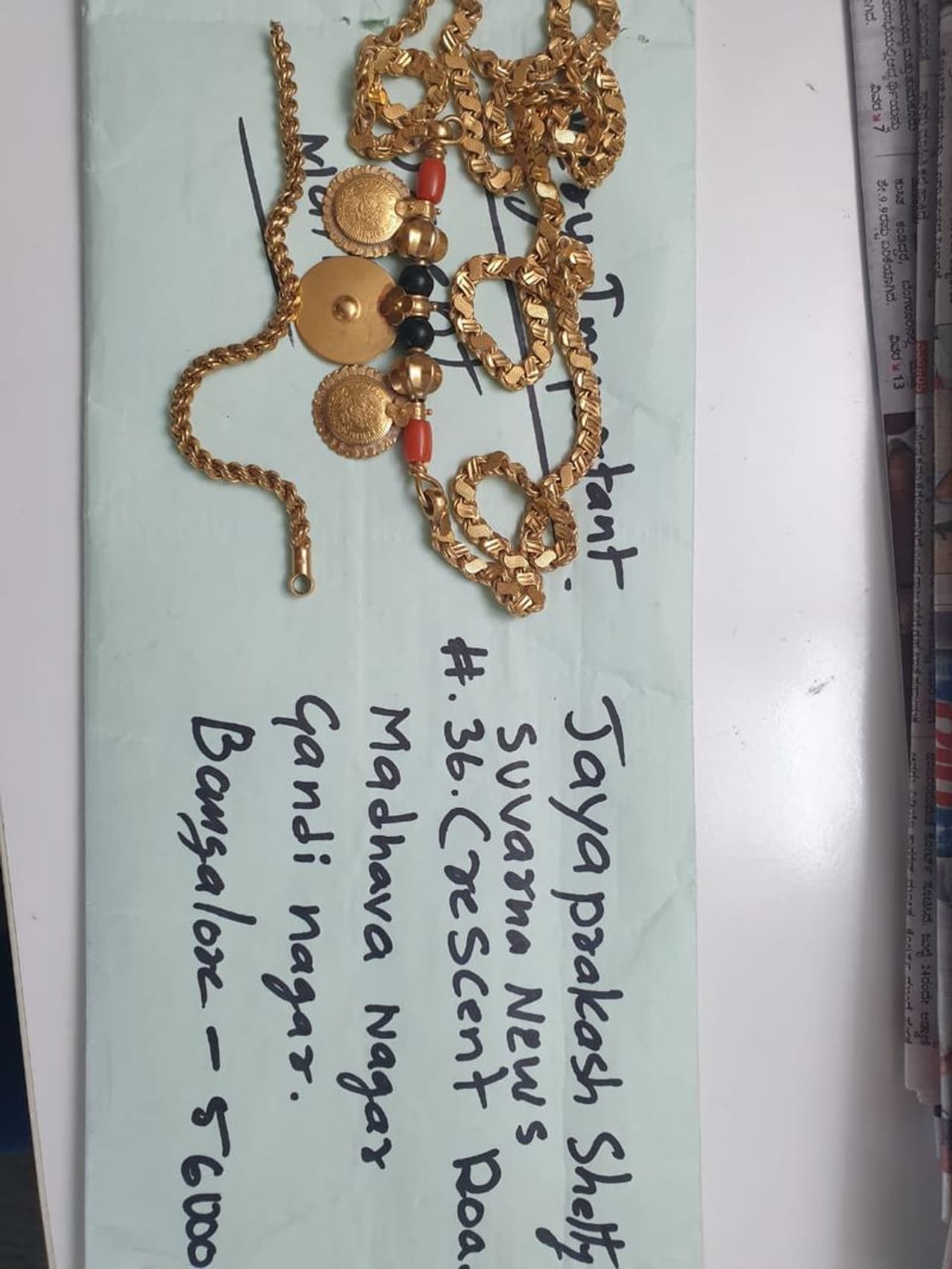 സുവർണാ ന്യൂസിലെ അവതാരകനായ ജയപ്രകാശ് ഷെട്ടിയുടെ വിലാസത്തിലാണ് മോഷ്ടാവ് മാല ആയച്ച് കൊടുത്തിരിക്കുന്നത്. മാലയുടെ ഉടമസ്ഥന്റെ അഡ്രസും കത്തിലുണ്ടായിരുന്നു. ഇന്ദിരാ നഗർ സ്വദേശിനിയായ കസ്തൂരിയുടേതായിരുന്നു മാല, സെപ്റ്റംബർ 9 ന് വഴിയരികില്വച്ച് തന്റെ താലി പറിച്ചോടിയ കള്ളനെതിരെ കസ്തൂരിയും ഭർത്താവും പൊലീസില് പരാതി നല്കിയിരുന്നു. പൊലീസിന്റെ സഹായത്തോടെ ദമ്പതികളെ കണ്ടെത്തി ചാനല് സ്റ്റുഡിയോയിലെത്തിച്ച് തല്സമയം മാല കൈമാറി.