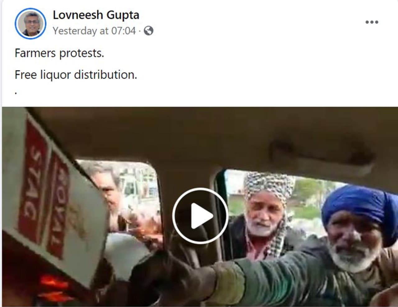 സമരത്തിനെത്തിയ കർഷകർക്ക് മദ്യം വിതരണം ചെയ്യുന്നു എന്ന അവകാശവാദത്തോടെയാണ് വീഡിയോ പ്രചാരണം.