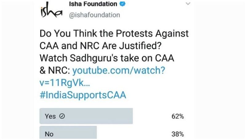 തിങ്കളാഴ്ചയാണ് ഇഷ ഫൗണ്ടേഷന്റെ ട്വിറ്റര് പേജില് പോള് പ്രത്യക്ഷപ്പെട്ടത്. പൗരത്വ നിയമ ഭേദഗതിക്കെതിരെയുള്ള പ്രക്ഷോഭം നീതിപൂര്വമാണെന്ന് നിങ്ങള് കരുതുന്നുണ്ടോ എന്ന ചോദ്യത്തോടൊപ്പം പൗരത്വ നിയമ ഭേദഗതിയെ അനുകൂലിച്ച് ജഗ്ഗി വാസുദേവ് നടത്തിയ പ്രസംഗം ഉള്പ്പെടുത്തിയായിരുന്നു ട്വീറ്റ്. എന്നാല്, പോളില് 62 ശതമാനം പേരും പൗരത്വ നിയമ ഭേദഗതിയെ എതിര്ക്കുകയും പ്രക്ഷോഭങ്ങളെ അനുകൂലിക്കുകയും ചെയ്തു. പോള് ഫലം എതിരായതോടെ ഇഷാ ഫൗണ്ടേഷന് പേജ് നീക്കം ചെയ്തെങ്കിലും സ്ക്രീന് ഷോട്ടുകള് ട്വിറ്ററില് പ്രചരിച്ചു.