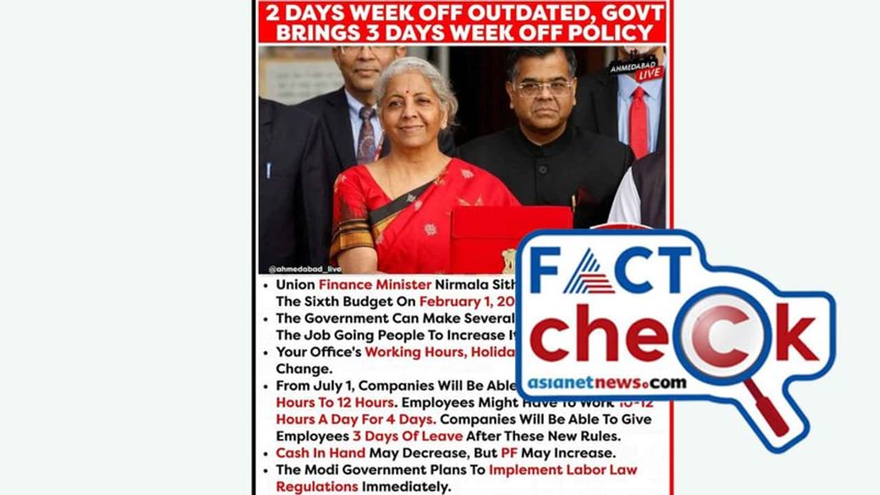 എന്നാല് രാജ്യത്തെ തൊഴില് മേഖലയില് വലിയ പരിഷ്കാരം വരുന്നതായുള്ള ഈ പ്രചാരണം കേന്ദ്ര സർക്കാർ നിഷേധിക്കുകയാണ്. തൊഴിലാളികള്ക്ക് ആഴ്ചയിലെ 3 ദിവസത്തെ അവധി നയം പ്രഖ്യാപിക്കുമെന്ന പേരിൽ കേന്ദ്ര ധനമന്ത്രിയുടെ പേരിൽ സാമൂഹ്യമാധ്യമങ്ങളിലെ തകൃതിയായി നടക്കുന്ന പ്രചാരണം തെറ്റാണ് എന്ന് പ്രസ് ഇന്ഫർമേഷ്യന് ബ്യൂറോയുടെ ഫാക്ട് ചെക്ക് വിഭാഗം അറിയിച്ചു.