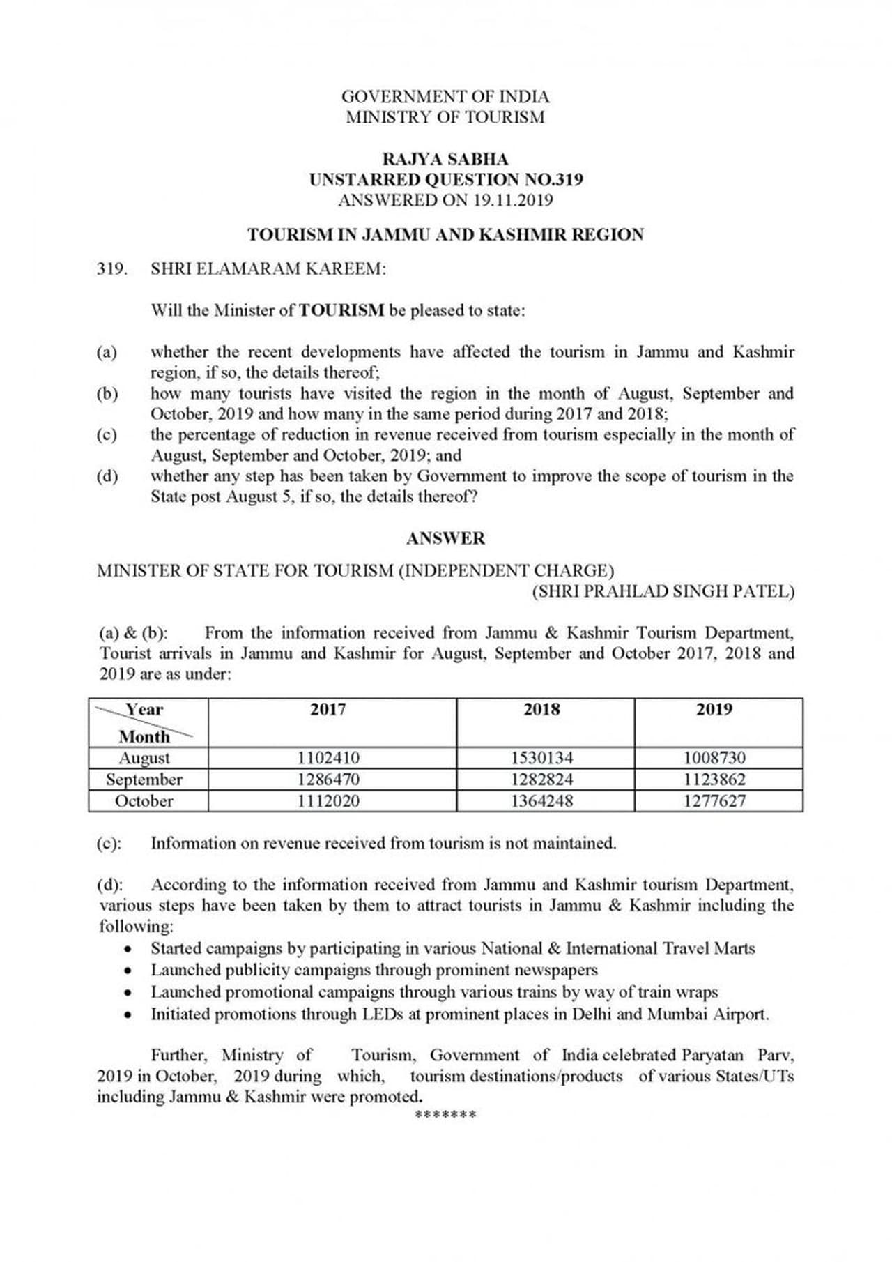 2019 നവംബര് 19ന് പാര്ലമെന്റില് സംസാരിക്കുമ്പോഴാണ് പ്രഹ്ളാദ് സിങ് പട്ടേല് ജമ്മു കശ്മീരിന്റെ ടൂറിസം മേഖലയെക്കുറിച്ച് സംസാരിച്ചത്. വിനോദസഞ്ചാര മേഖലയിലോ ടൂറിസത്തില് നിന്നുള്ള വരുമാനത്തിലോ കുറവ് വന്നിട്ടില്ലെന്ന് മന്ത്രി പാര്ലമെന്റില് പറഞ്ഞിരുന്നു. രാജ്യസഭാ എംപിയും സിപിഐ നേതാവുമായ എളമരം കരീമിന്റെ ചോദ്യങ്ങള്ക്ക് മറുപടി നല്കുകയായിരുന്നു മന്ത്രി.